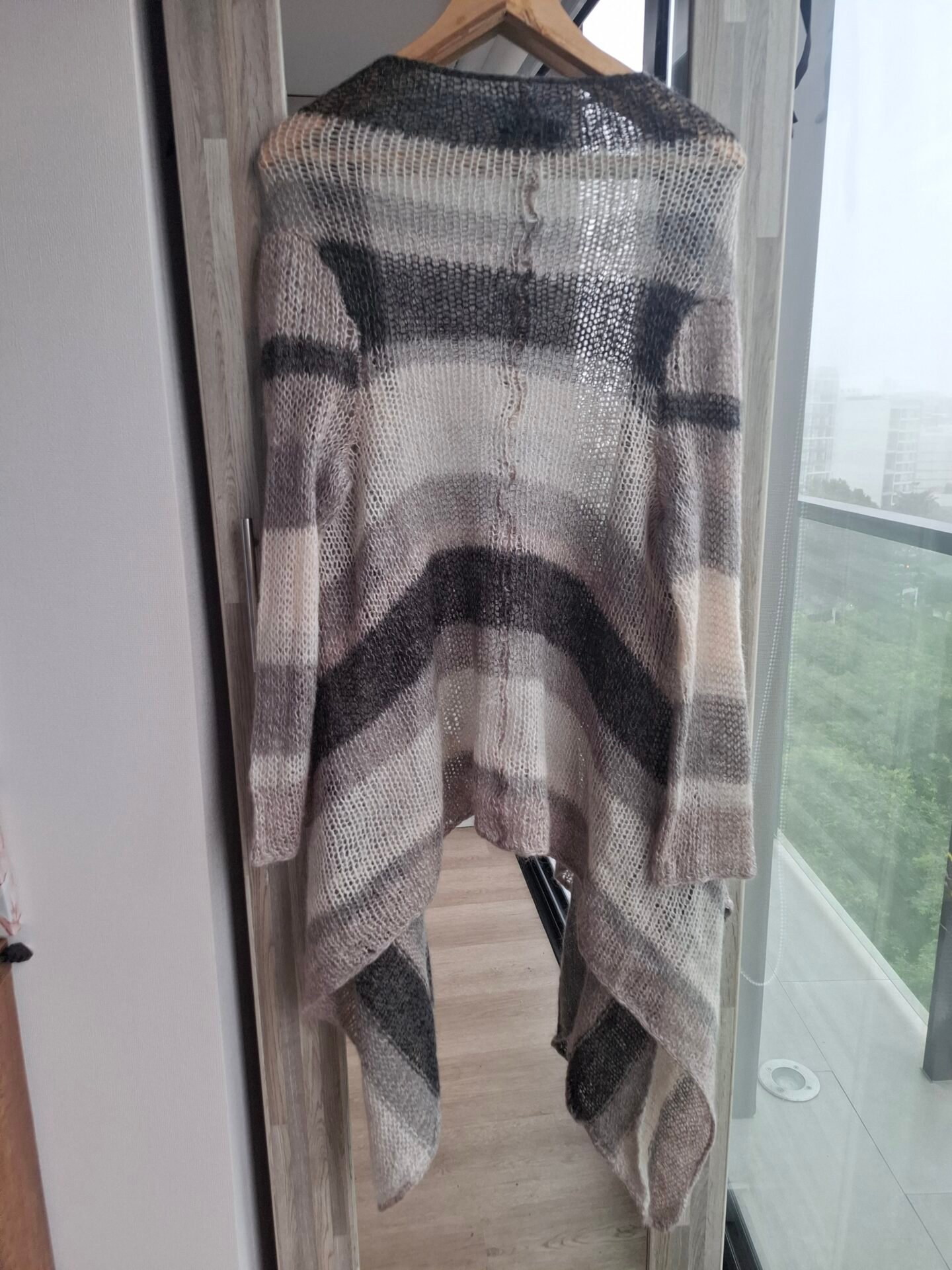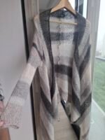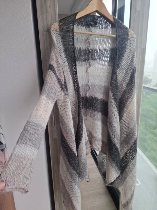 🤍Cárdigan de tejido calado en tonos neutros (beige, gris y negro), con un diseño moderno y relajado que aporta estilo sin esfuerzo. Su caída fluida y asimétrica genera un efecto envolvente muy favorecedor.