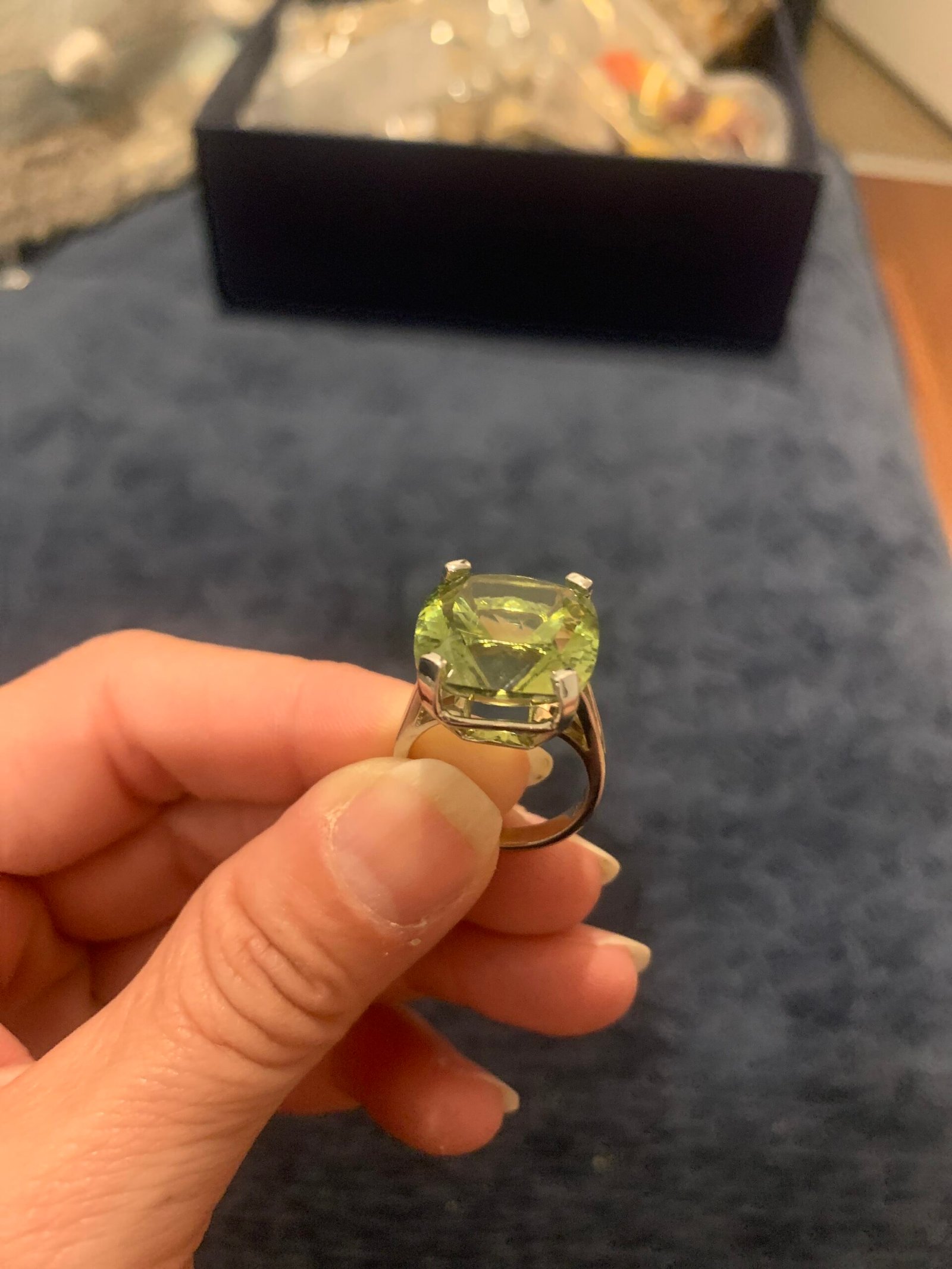 Hermoso anillo plateado con piedra verde grande.