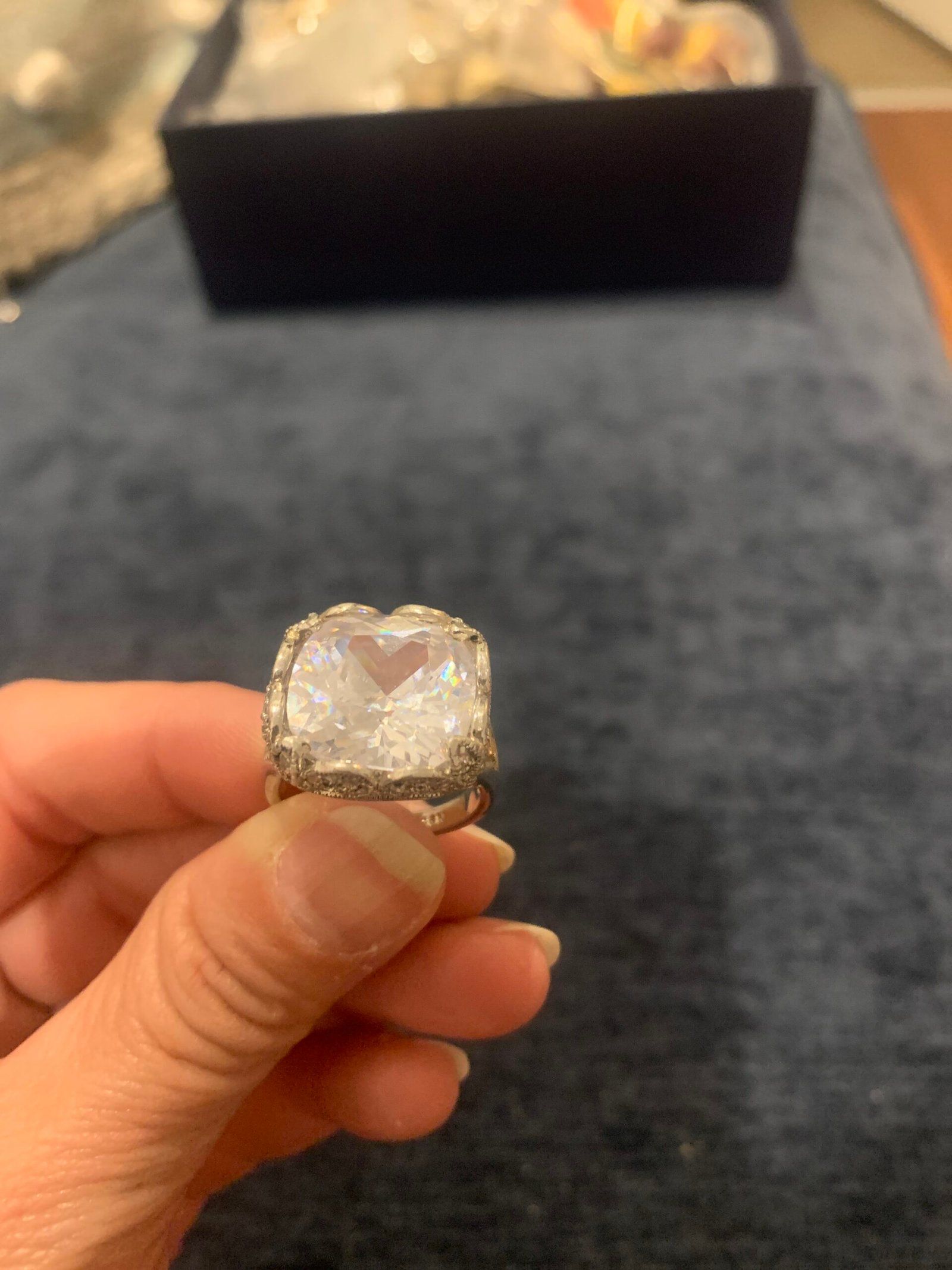 Hermoso anillo de fantasía plateado con piedra brillante grande.
