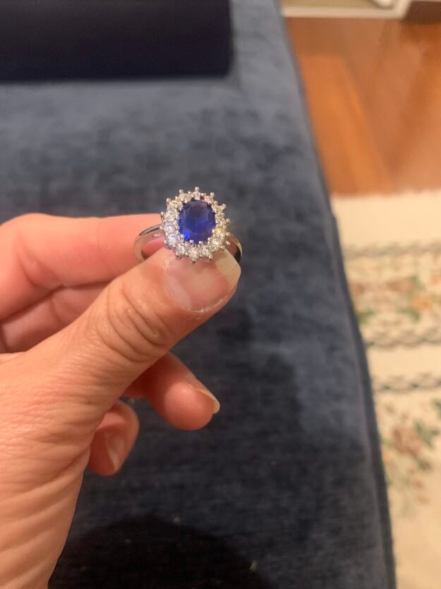 Hermoso anillo plateado con piedra azul y brillantes. Tamaño grande. Nunca usado