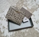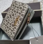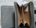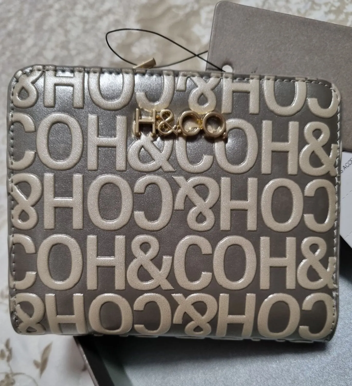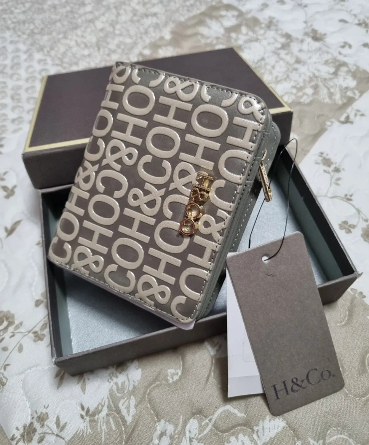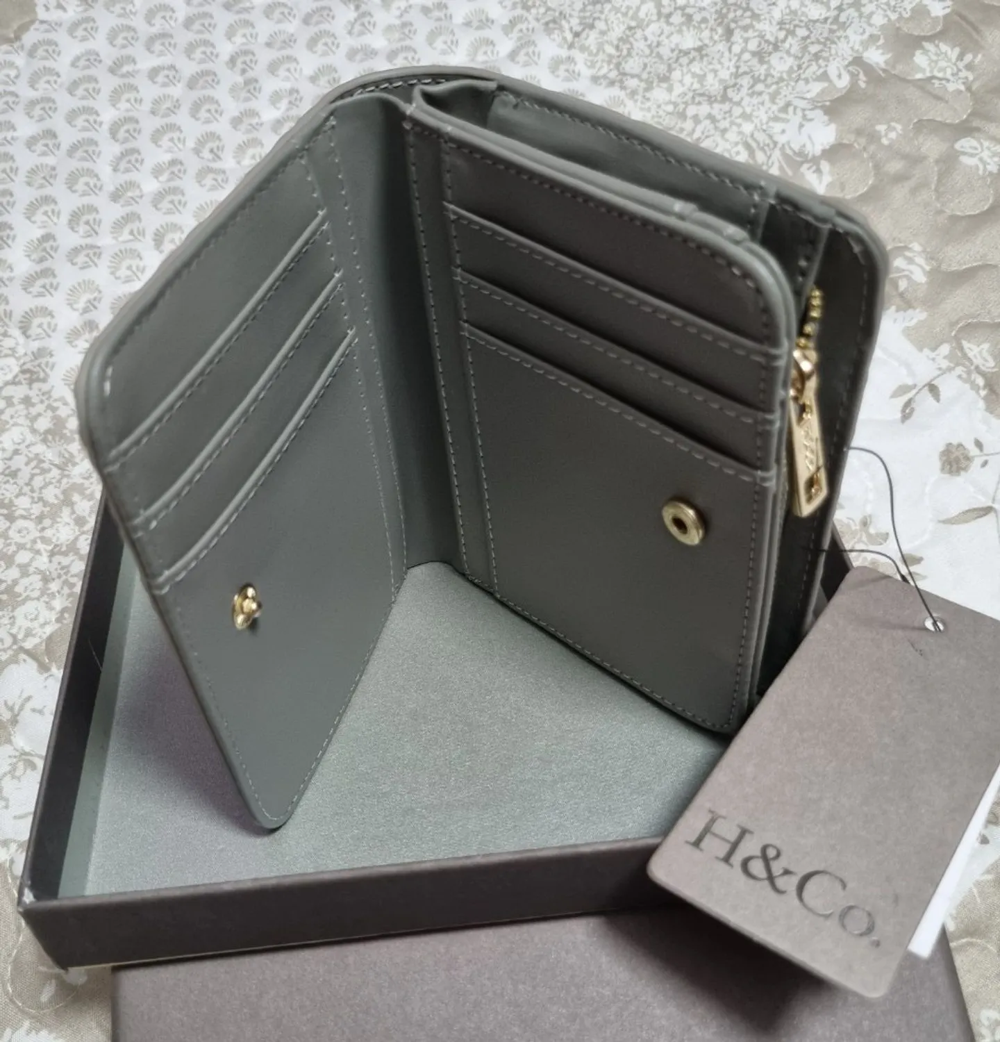 billetera color grafito con varios compartimentos para tarjetas y un bolsillo con cremallera para monedas. marca H&CO. material interior polyester. medidas 12x10cm. nuevo con etiqueta, sin uso, sin defectos. totalmente nuevo. precio original s/. 99.99