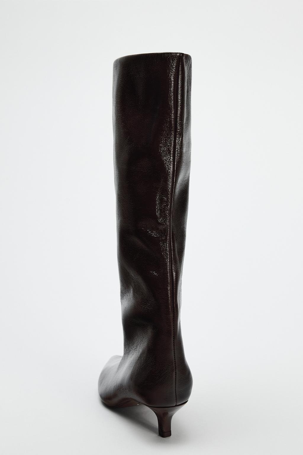 bota zara caña ancha con efecto acharolado, tacón kitten. acabado en punta. rojo burdeos