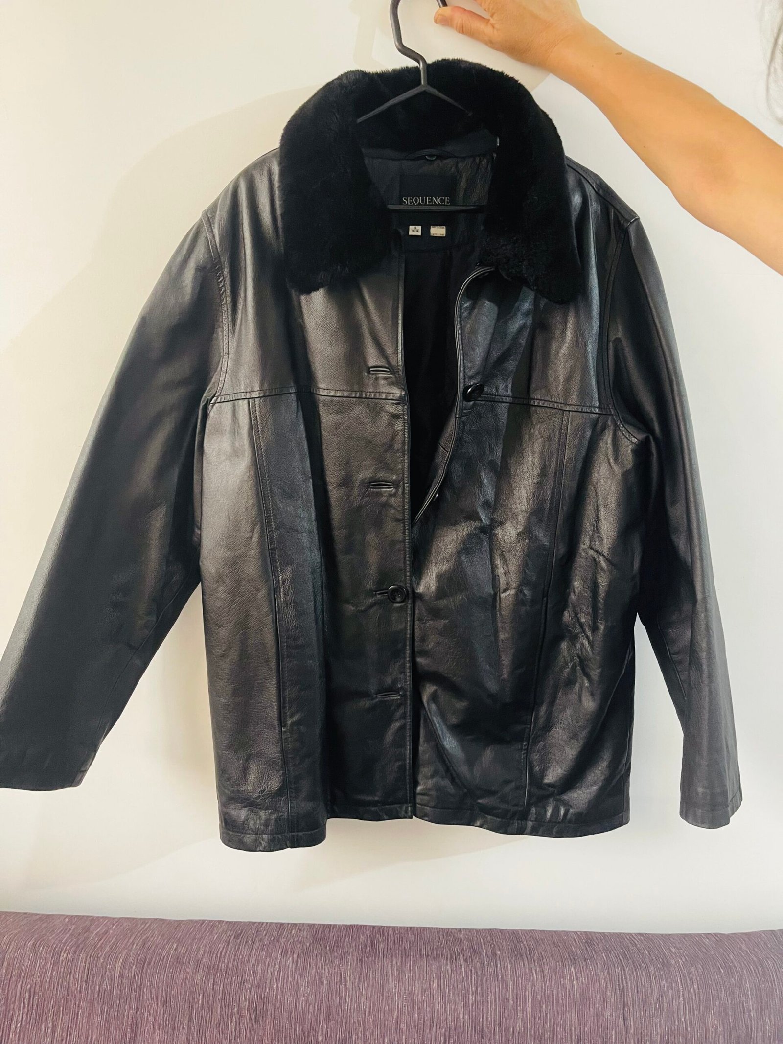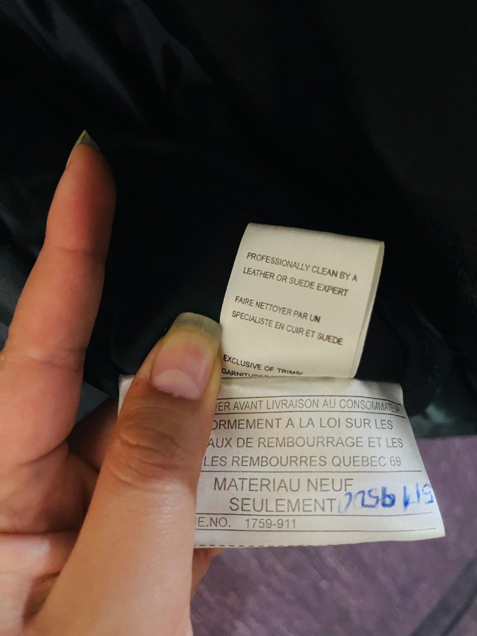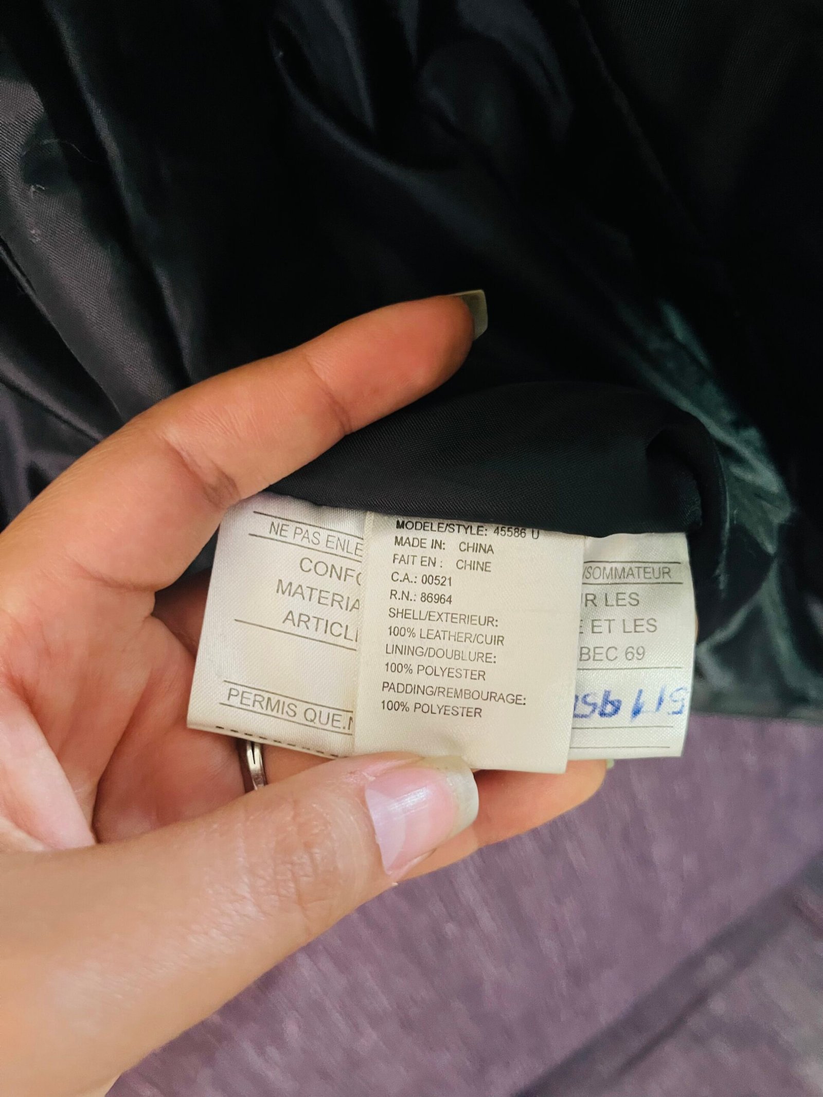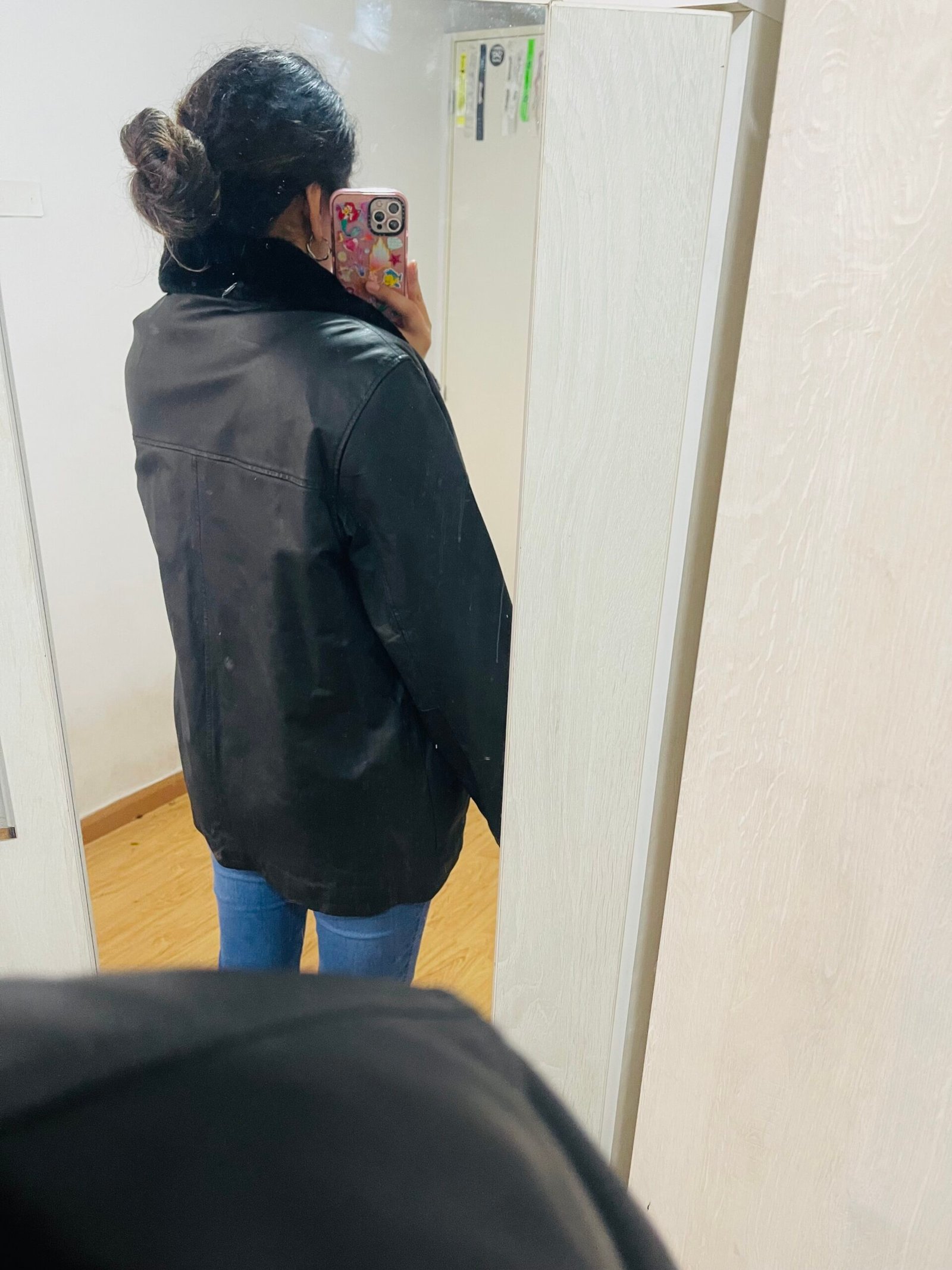 Casaca de cuero 100% comprada en Canadá y hecho en china, el cuello de peluche es removible. Es talla L. Yo mido 1.73 y soy delgada y uso talla M pero la casaca me queda más grande por ende es L u XL pequeña. Está en perfectas condiciones.