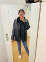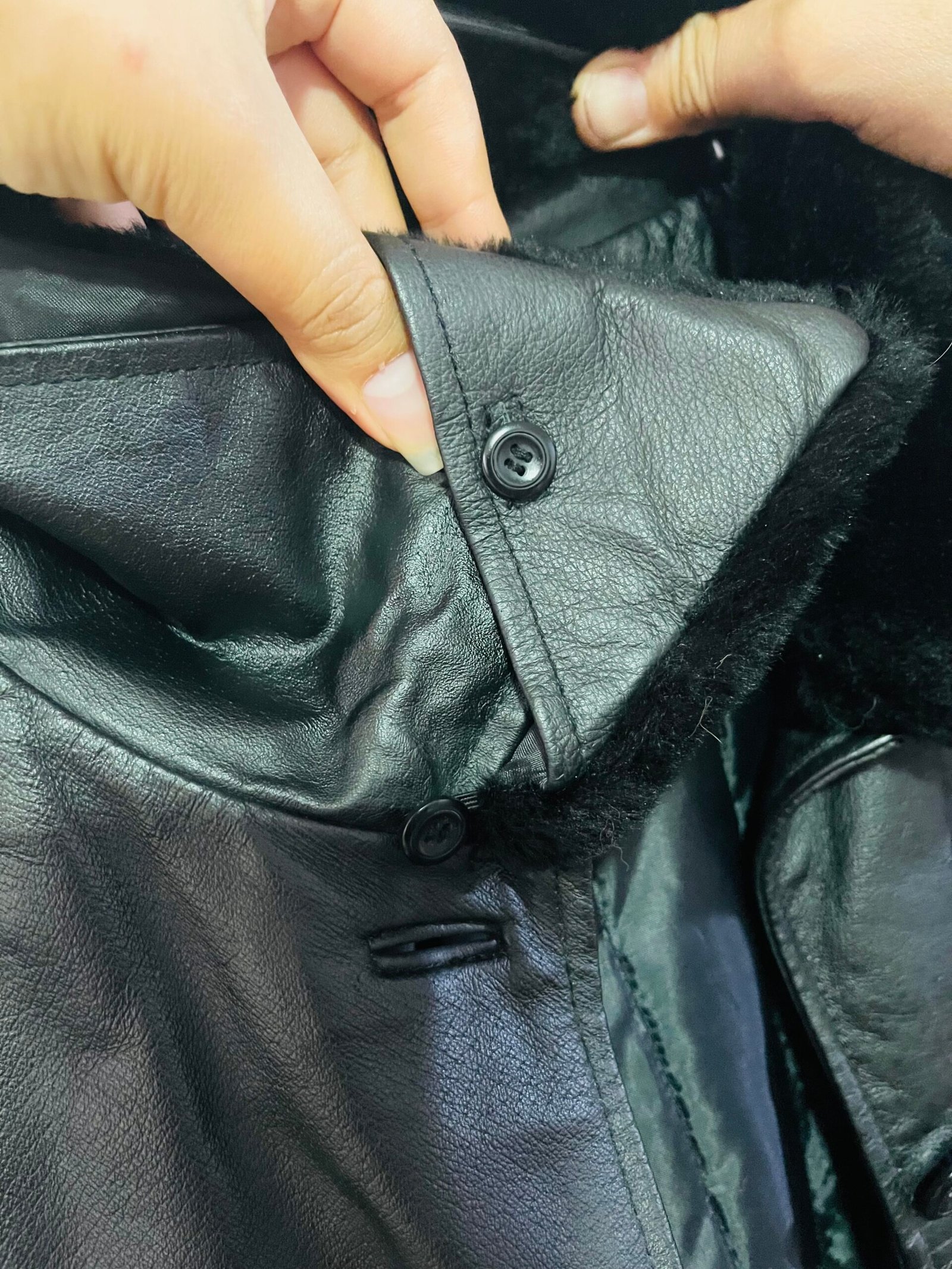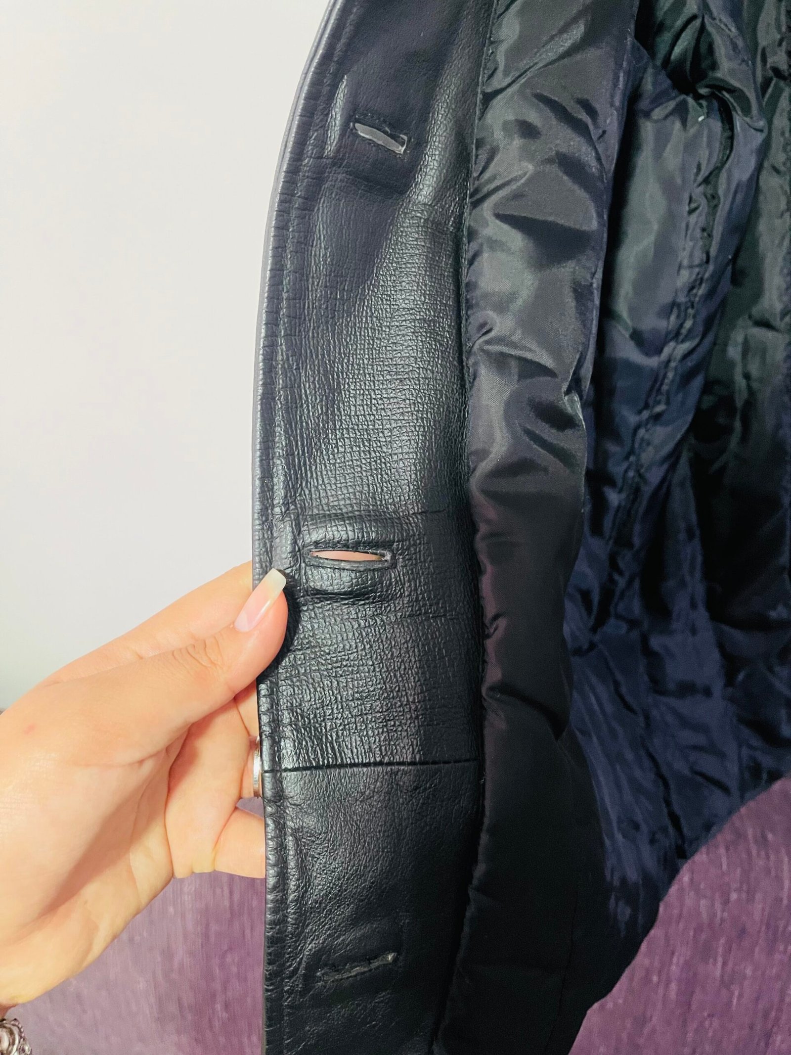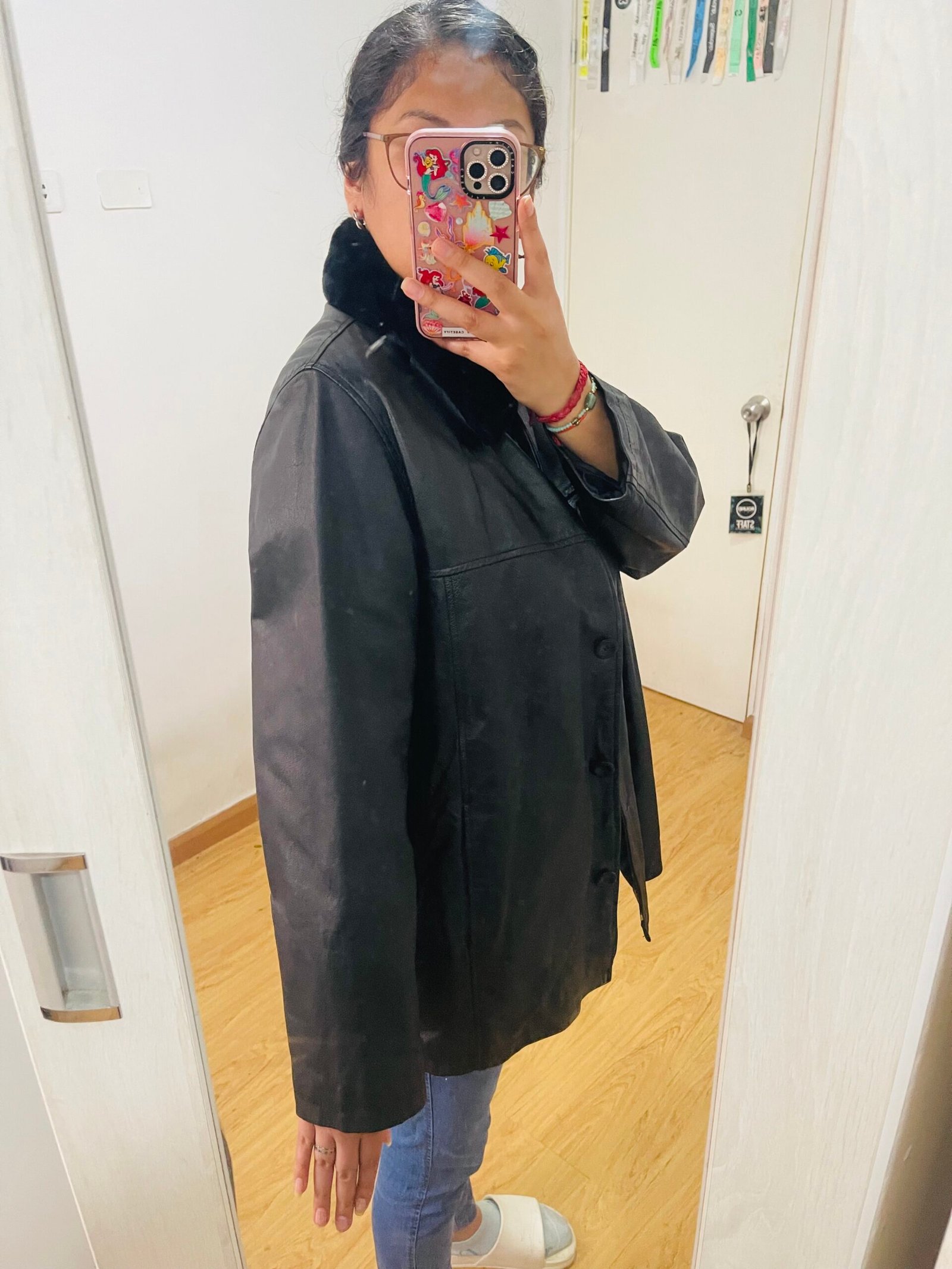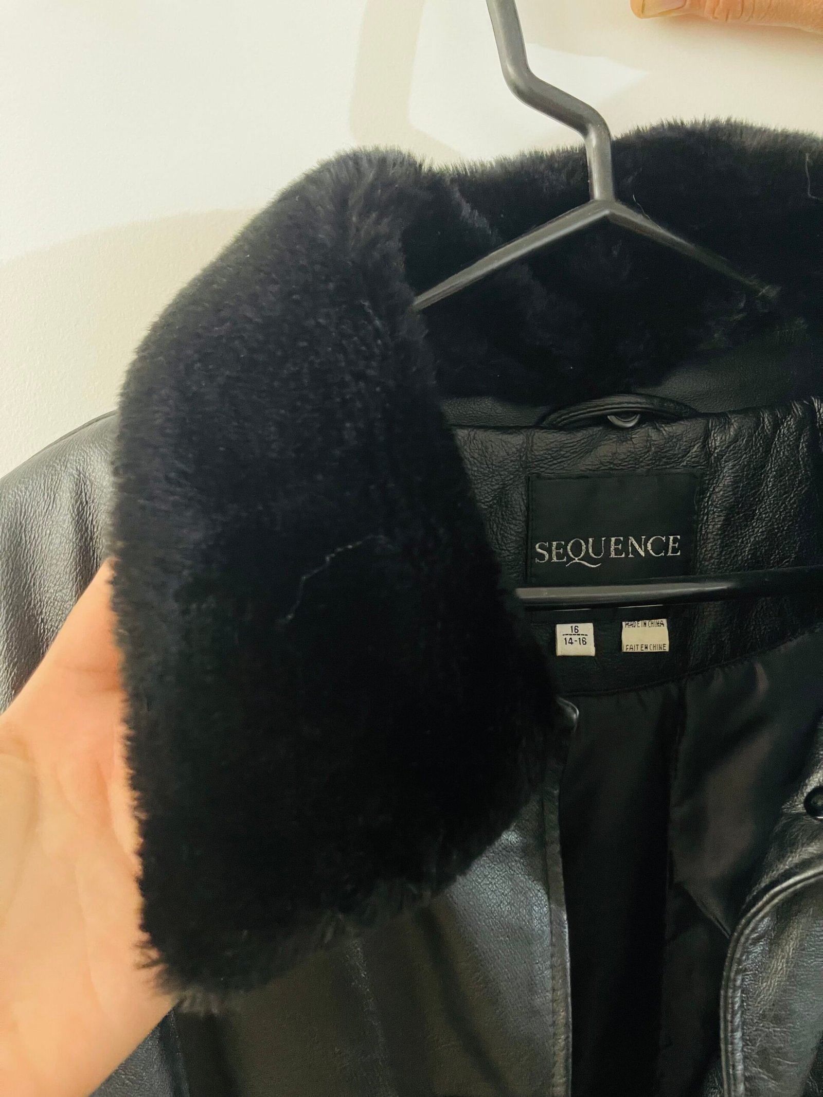 Casaca de cuero 100% comprada en Canadá y hecho en china, el cuello de peluche es removible. Es talla L. Yo mido 1.73 y soy delgada y uso talla M pero la casaca me queda más grande por ende es L u XL pequeña. Está en perfectas condiciones.