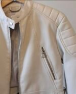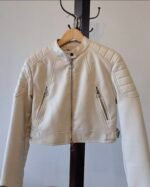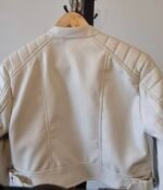 CASACA cuero sintético marfil super canchera msrca stravidarius xs. largo: 40 cm, hombros: 40 cm mangas: 58 cm, sisa: 40 cm.