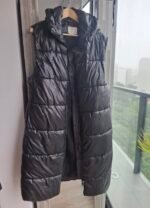 Chaleco tipo puffer de H&M, en color negro con acabado levemente satinado que le da un look moderno y elegante. Su diseño largo estiliza la figura y brinda mayor abrigo, ideal para días frescos o fríos.