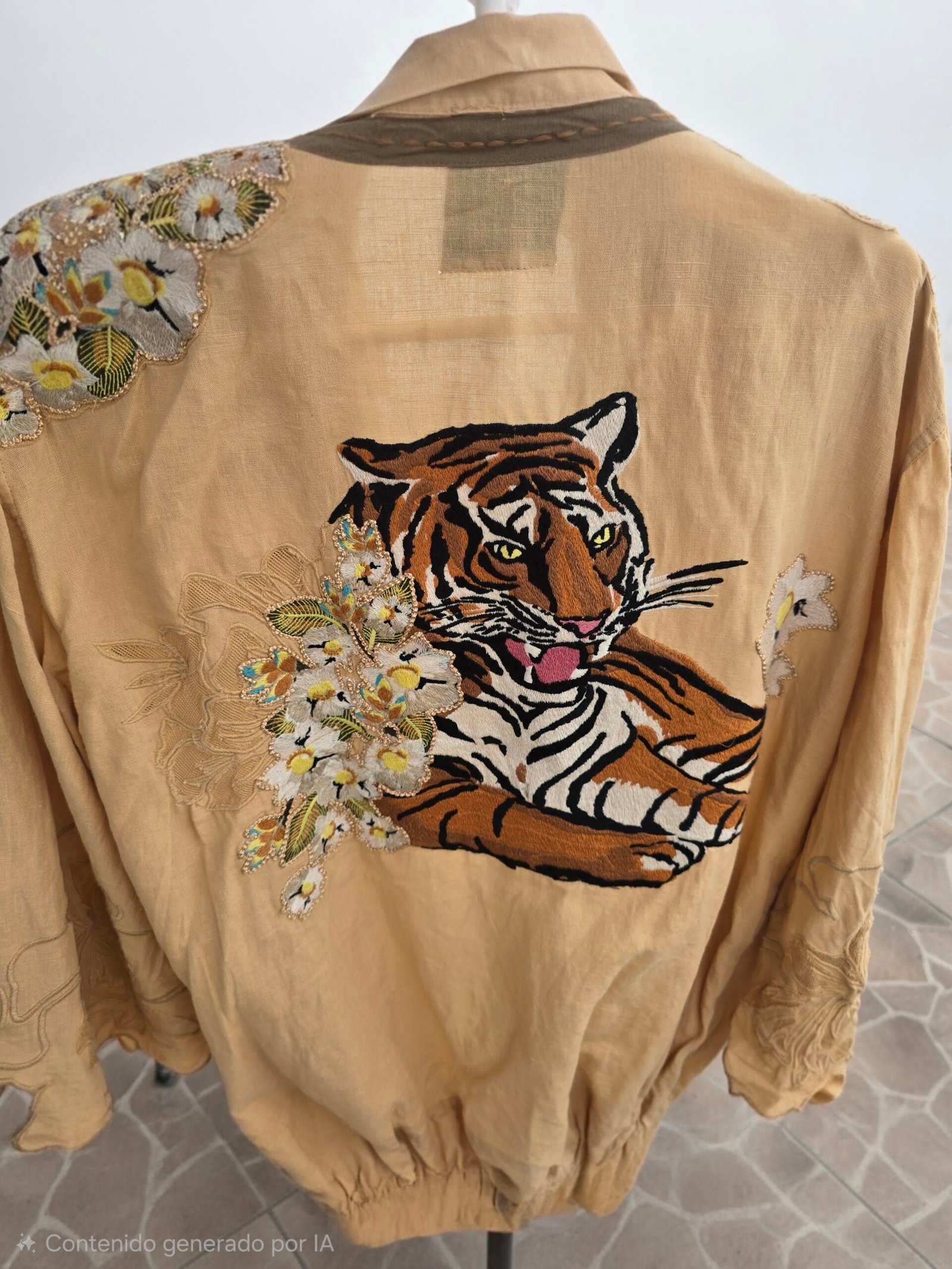 Hermosa chaqueta de lino, talla Medium, original de Jazmin Chebar con un bordado de tigre, mangas anchas y bordadas.