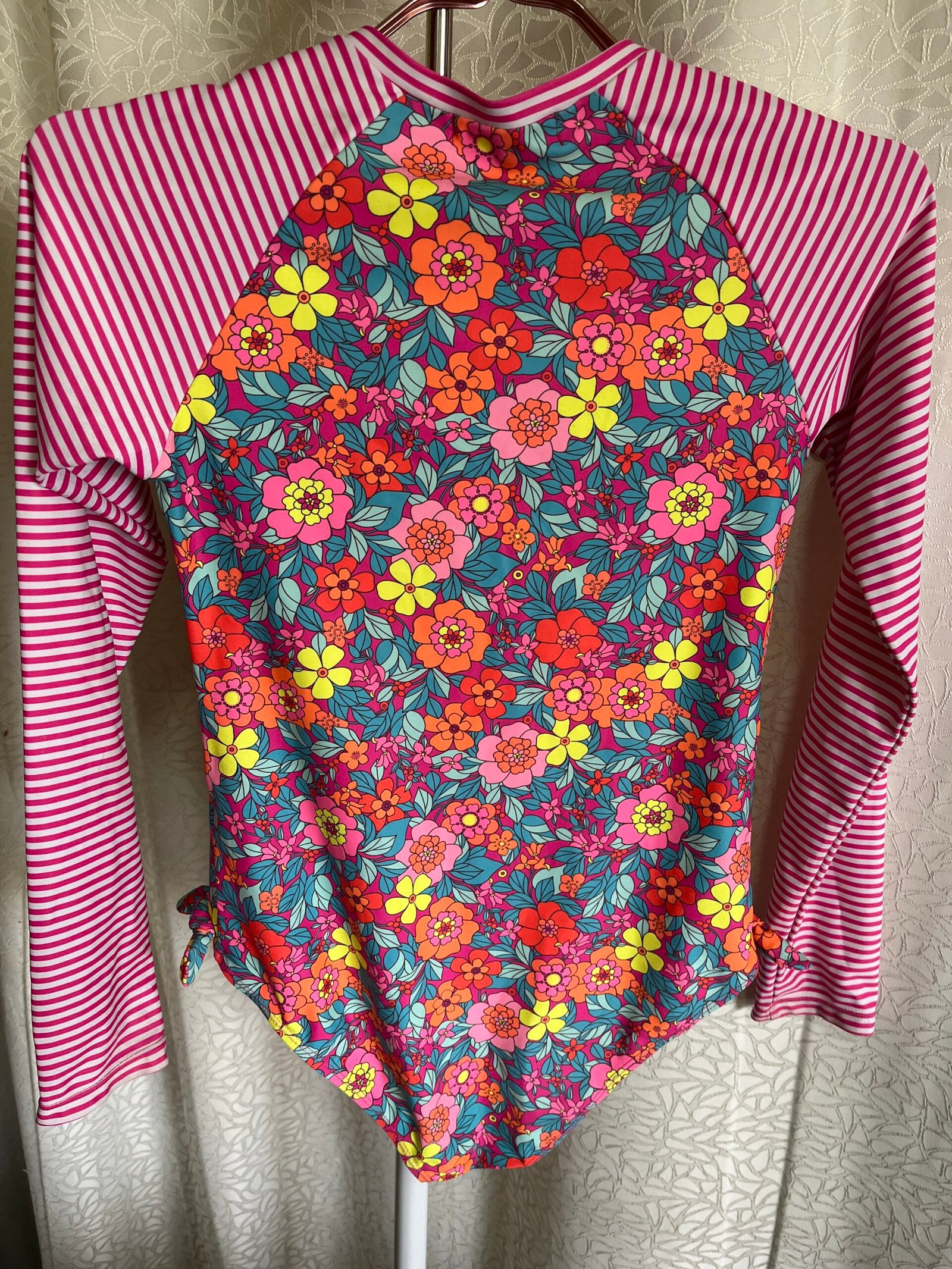 - enterizo de baño talla 16, color rosado con franjas y estampado de flores en licra brasileña. Estado 9 de 10.