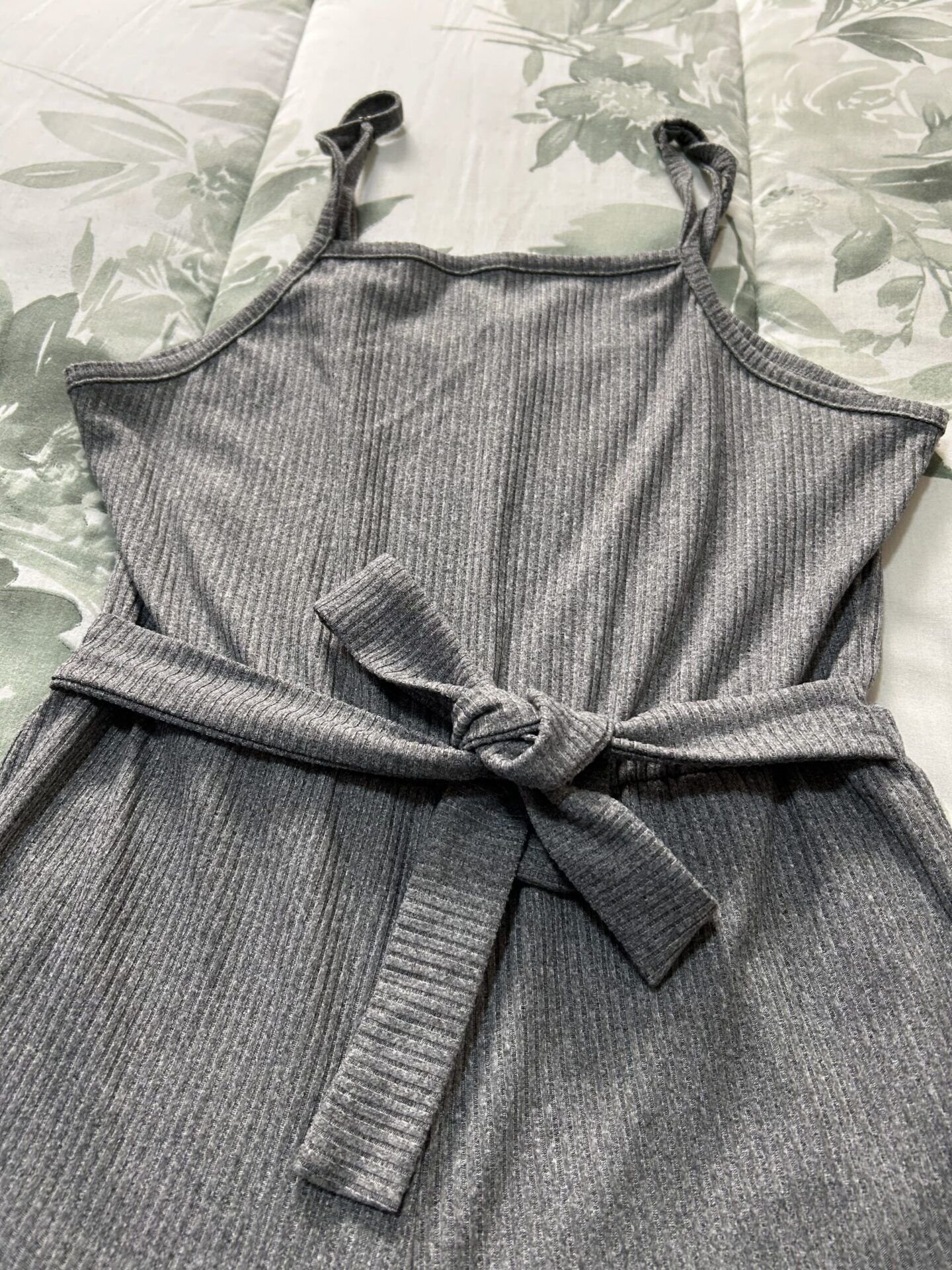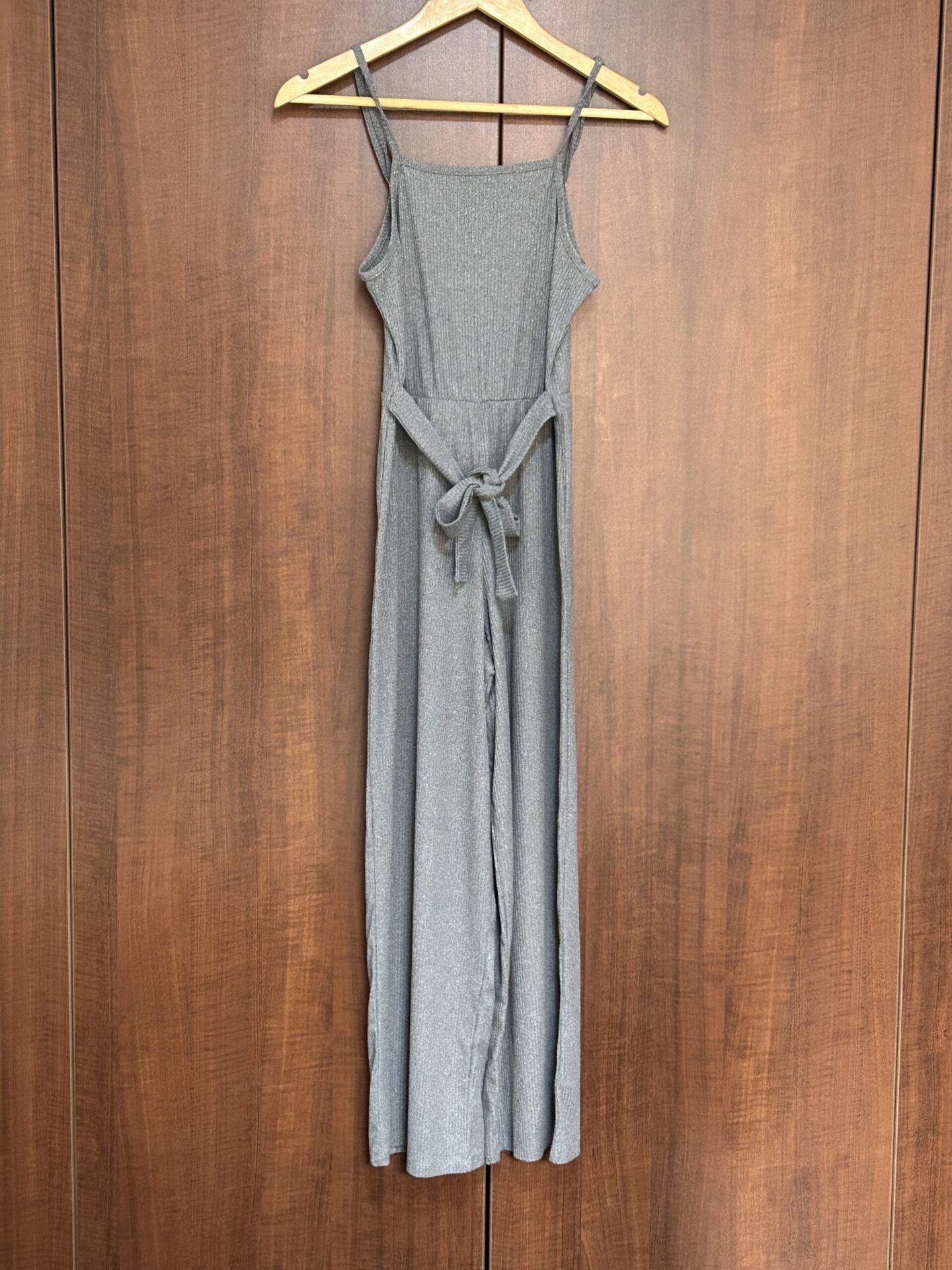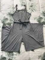 Enterizo palazo color gris, cuenta para amarrar y ajustar la cintura en la parte de adelante o por atrás.