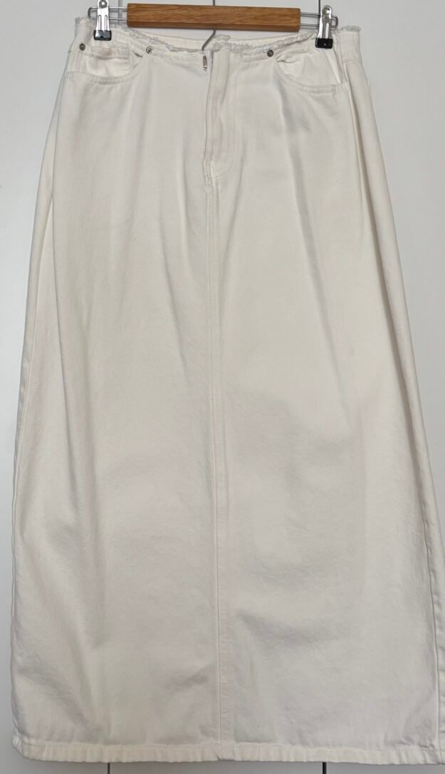 Falda denim sin pretina color blanco roto, marca Lefties España, talla L largo midi con apertura posterior.
