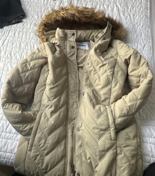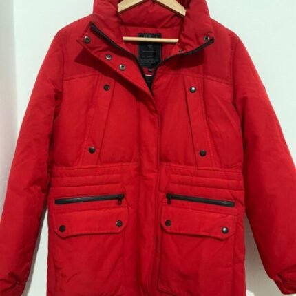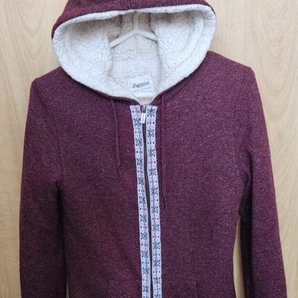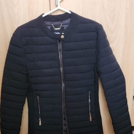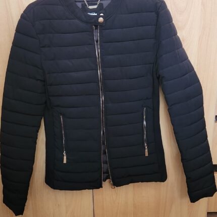 una jacket de mujer , con cierre y botones , tiene bolsillos , el gorro es removible tiene cierre y botones