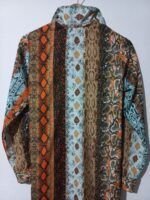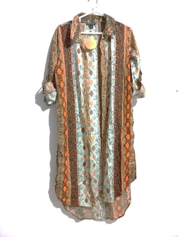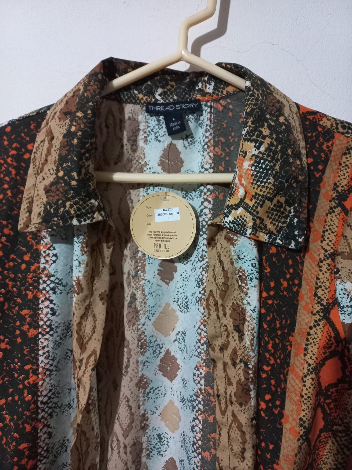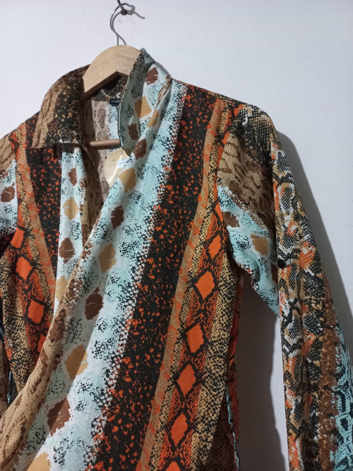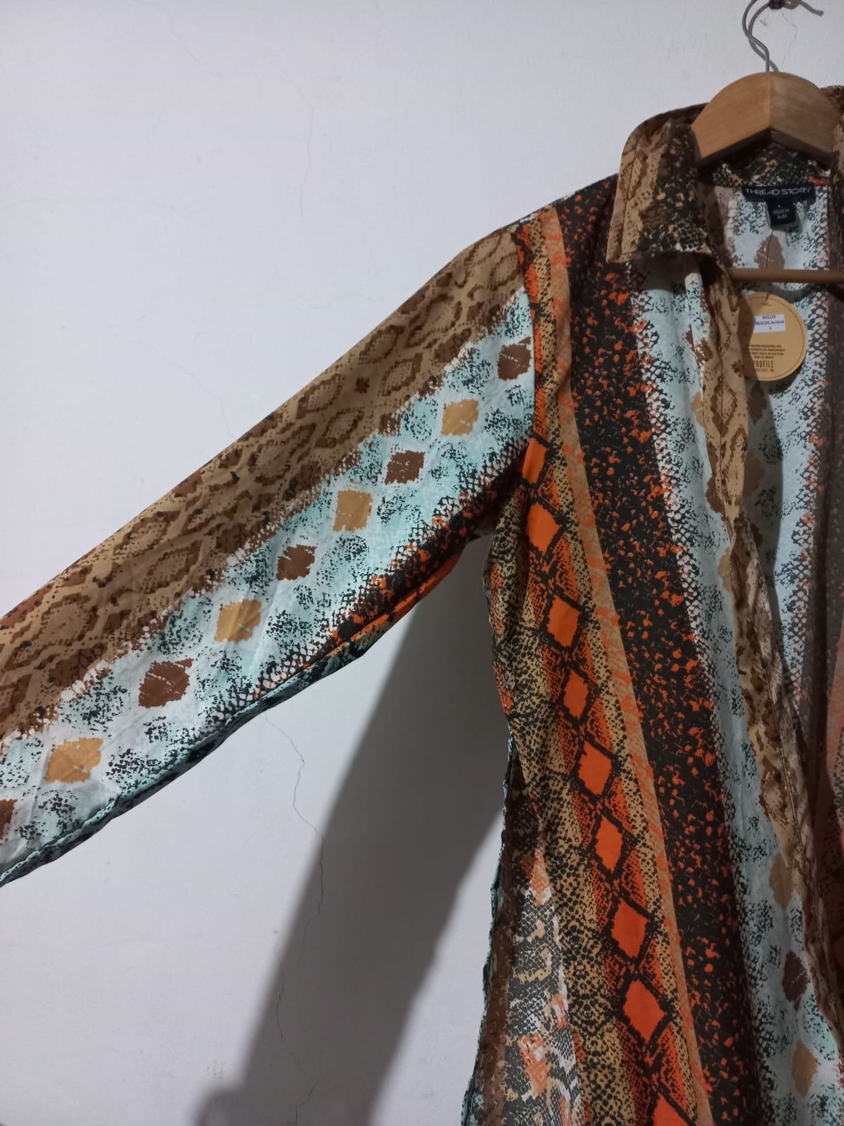 Exclusivo Kimono animal print, snake skin (piel de serpiente), cuello camisero, para usar manga larga o remangar (tiene botones para hacerlo más corto). Bordes inferiores redondeados, con abertura a los costados que simula cola de pato. Puedes usarlo tanto casual como formal, es en tonos ocre, tierra, negro y contraste con un suave turquesa. De la tienda Thread Story, manufactura india. Calidad poliéster. Largo 110 cms. Talla Large