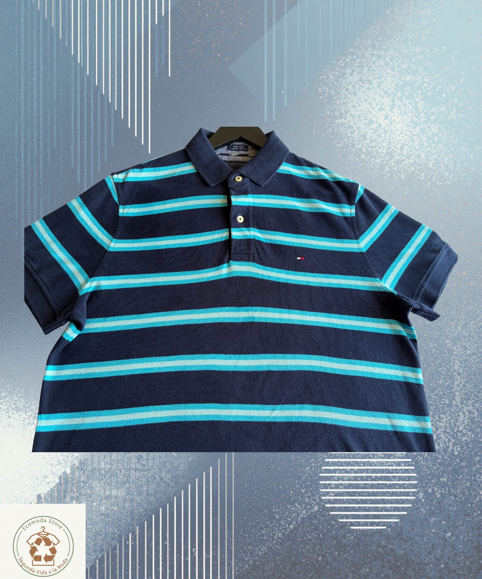 Polo Tommy Hilfiger para hombre en excelente estado, con estampado característico y color azul marino con líneas celestes. Ideal para usar en días casuales, ofrece una comodidad y estilo sin igual. Perfecta para añadir un toque deportivo a tu guardarropa.
