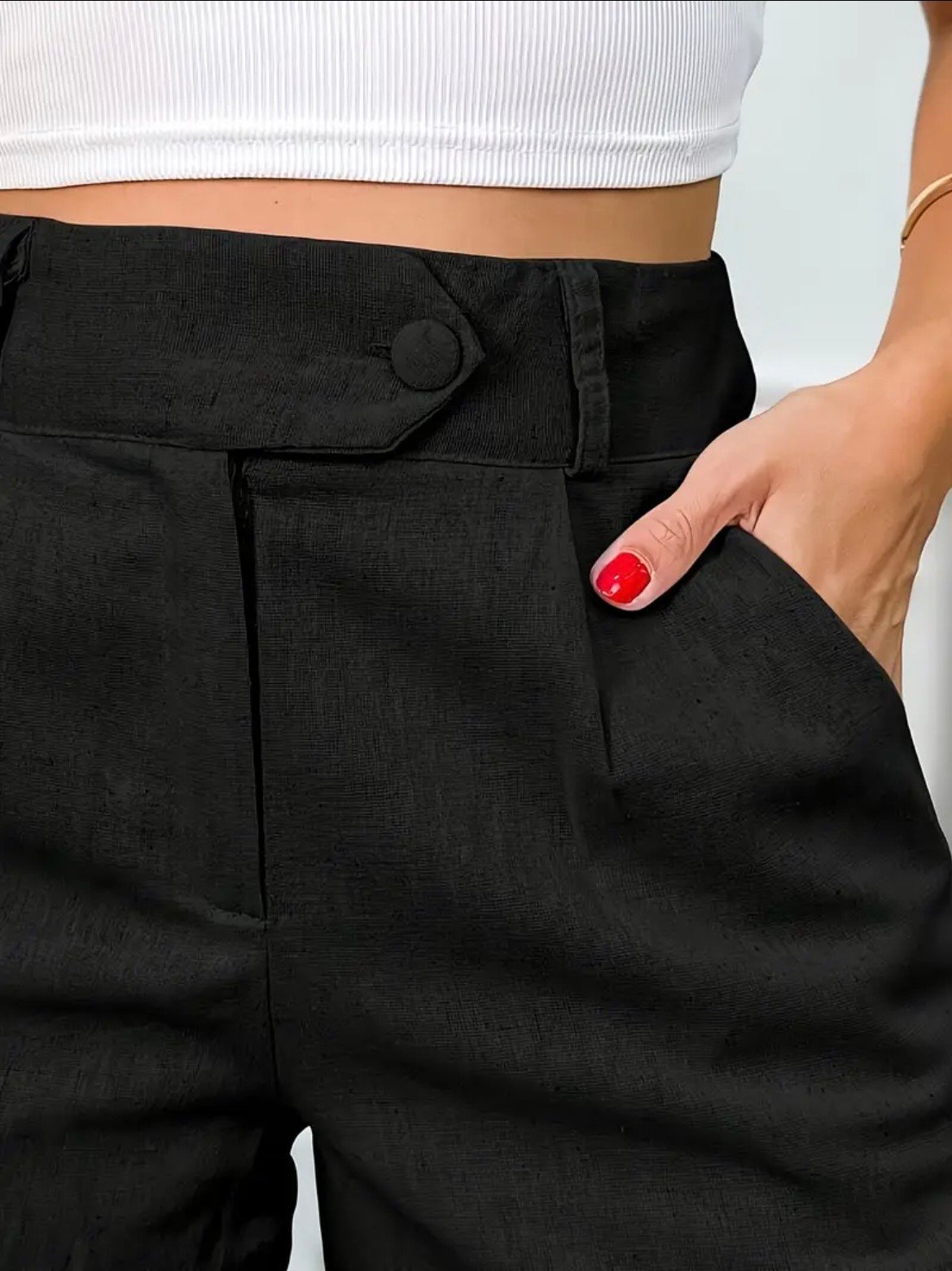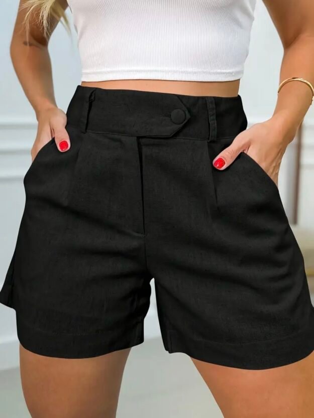Shorts negros para mujer. Color negro no transparente. Sin elasticidad, no estiran ni se deforman. 30% lino; 55% viscosa; 15% poliéster. Cierre y 2 botones en frente; 2 bolsillos en frente.