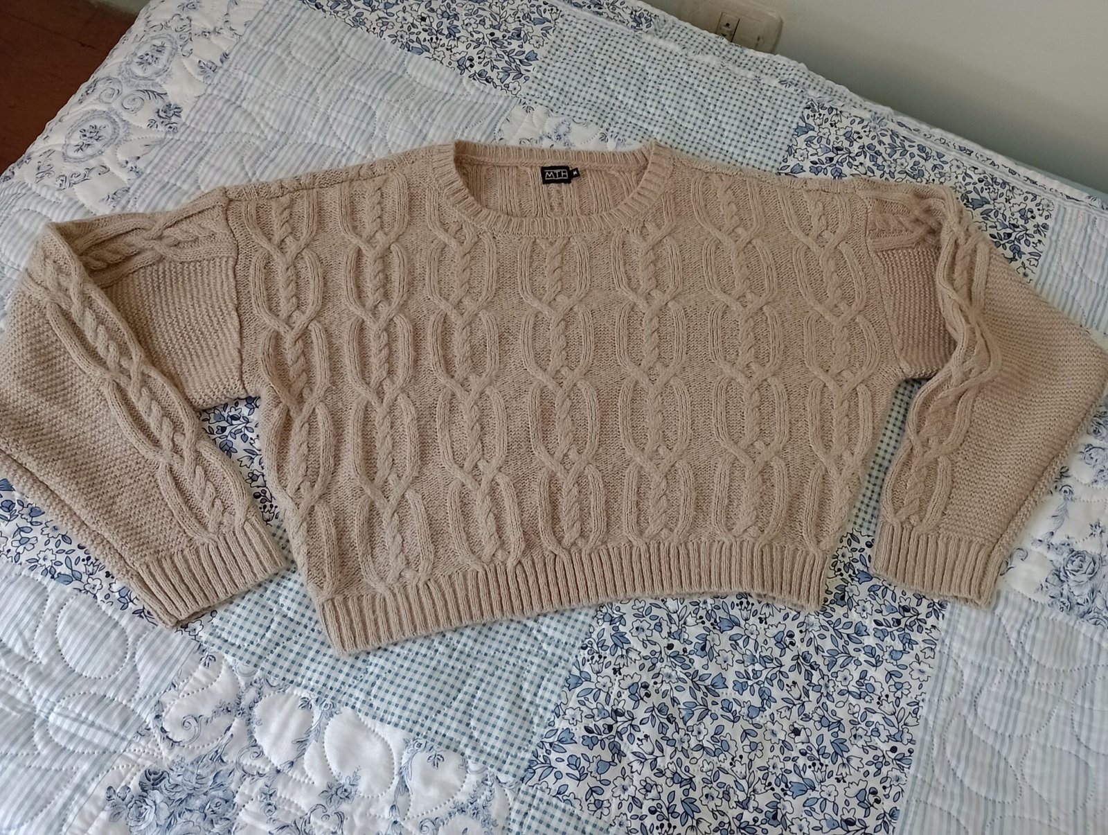 La chompatienedetalleen el tejido.talla M.tipo crop ala cintura.
