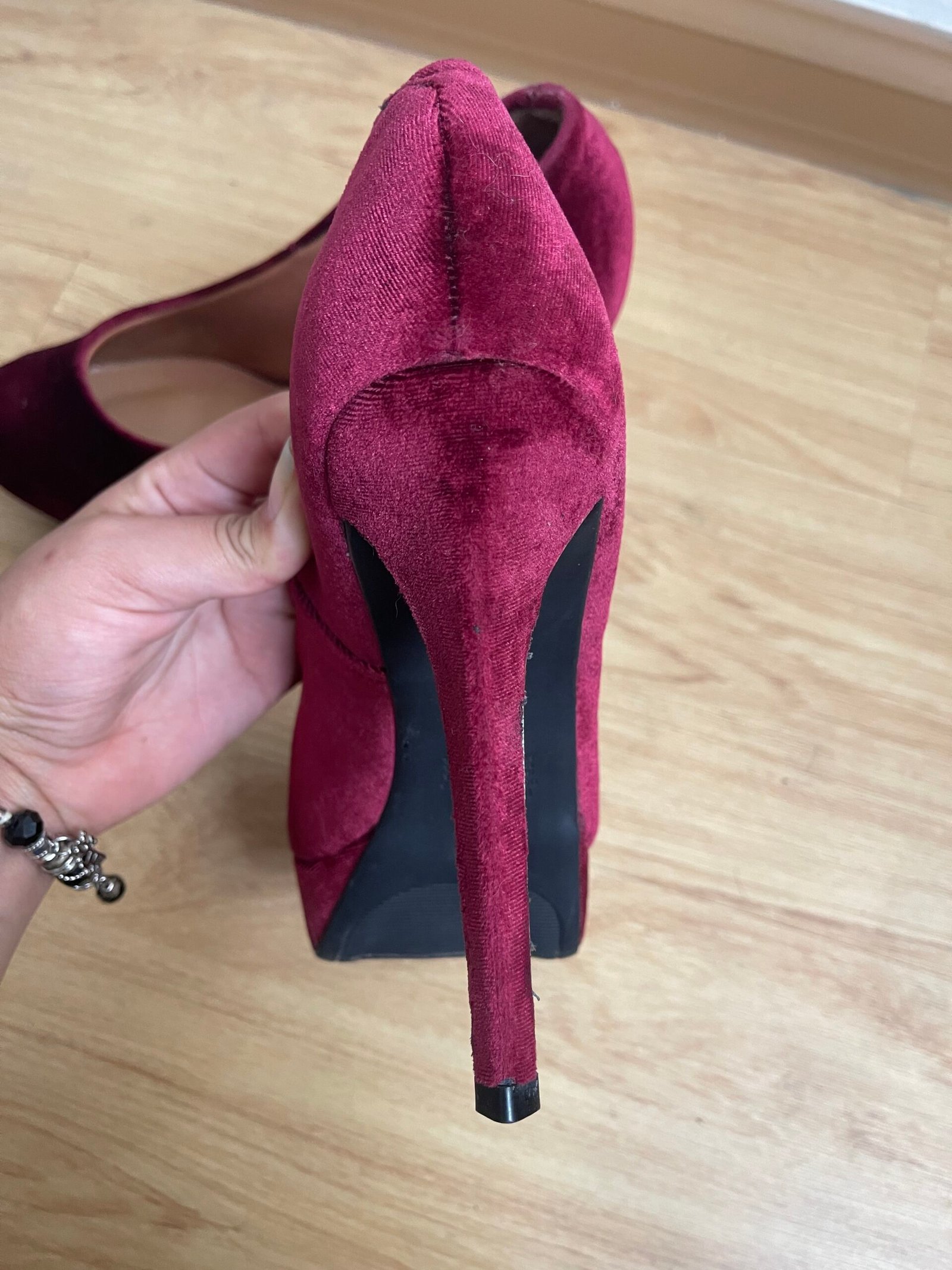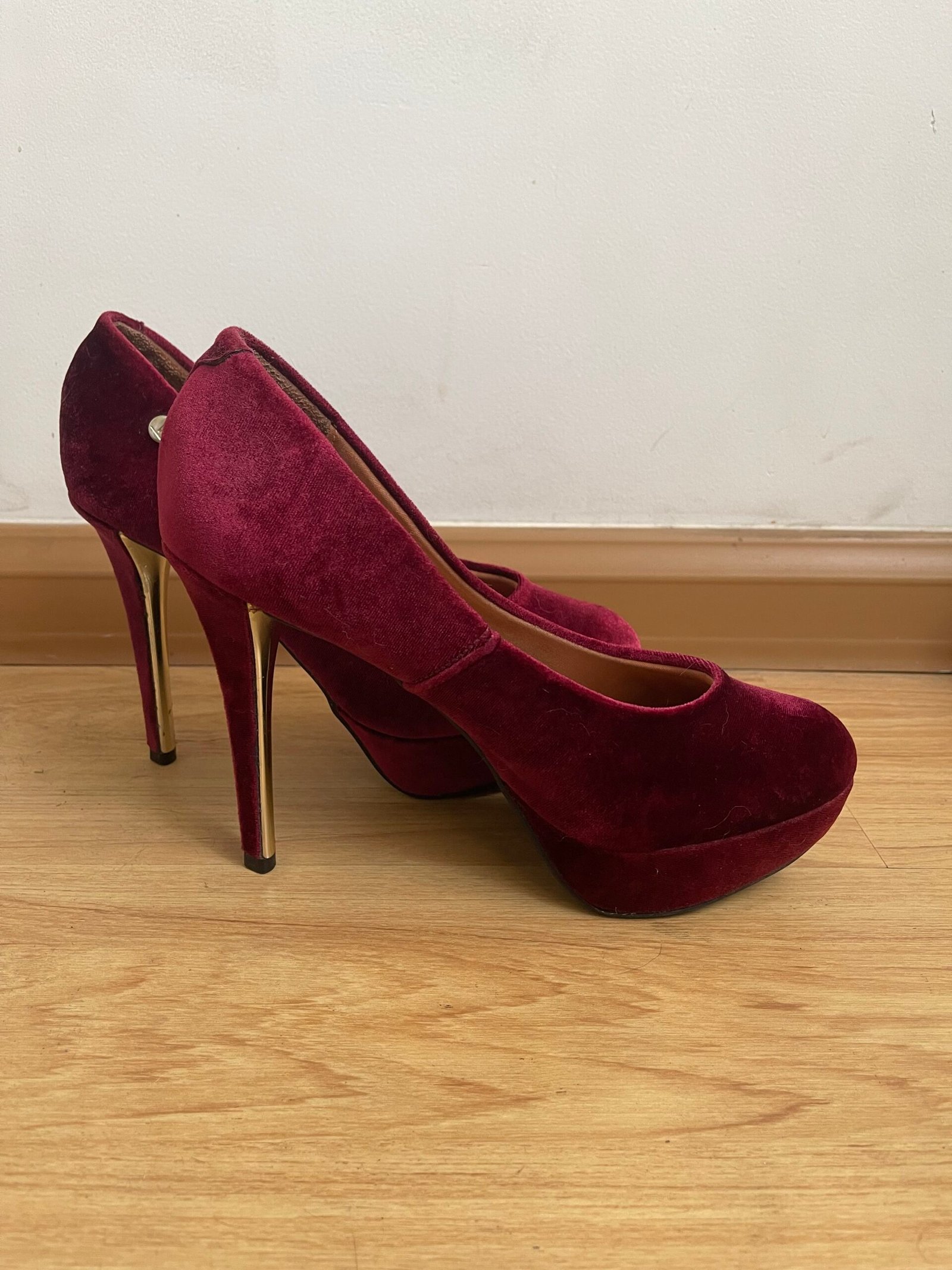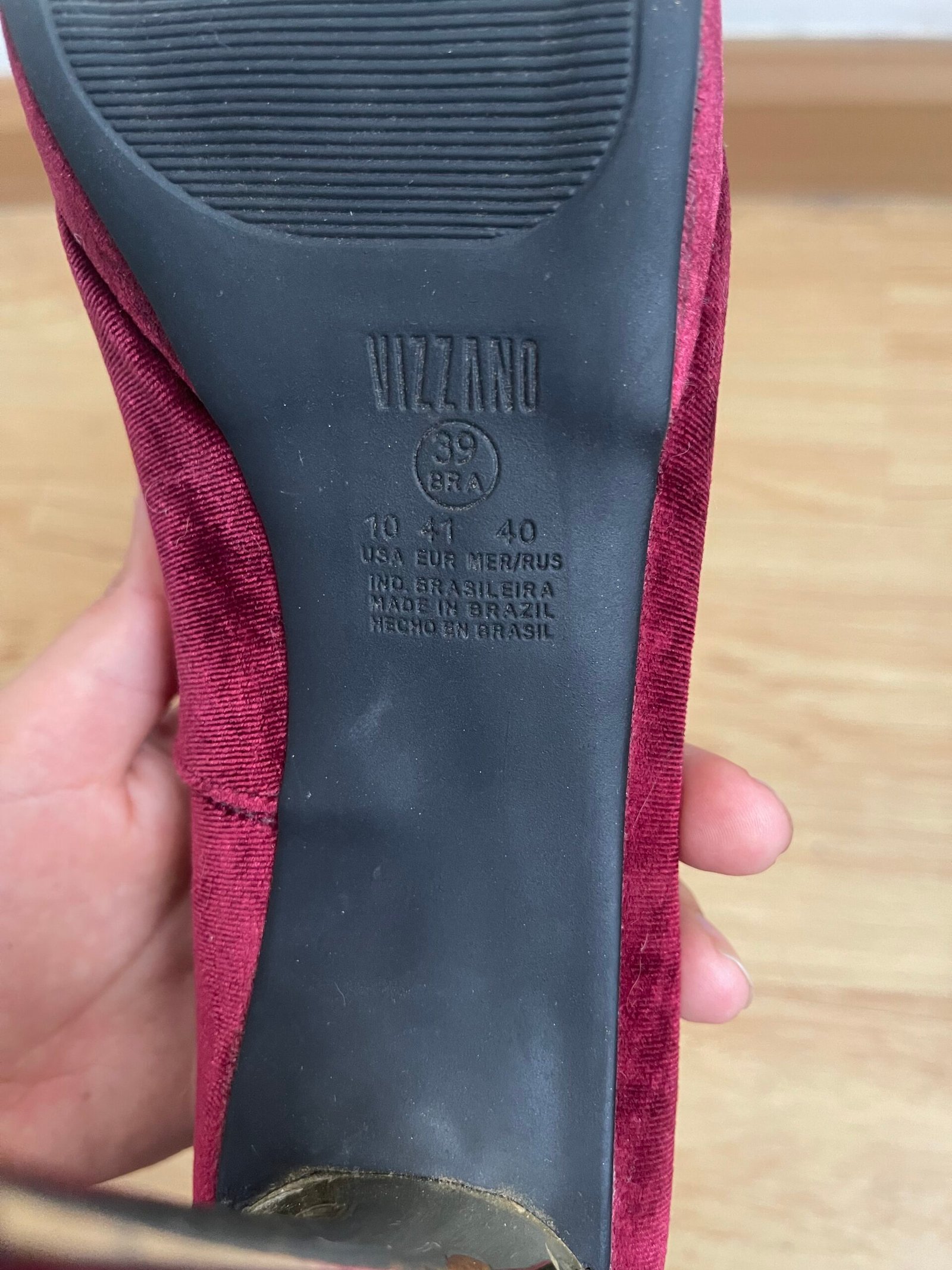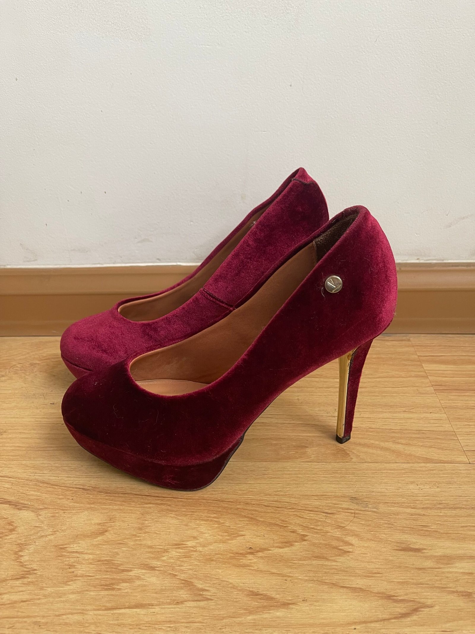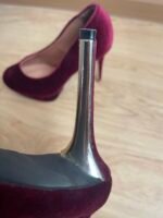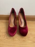 Zapatos nuevos, me los compré y me quedaron grandes yo soy talla 40 y estos tacos son talla 41 aprox 26.5 cm del zapato. Material de terciopelo rojo vino. Taco 12