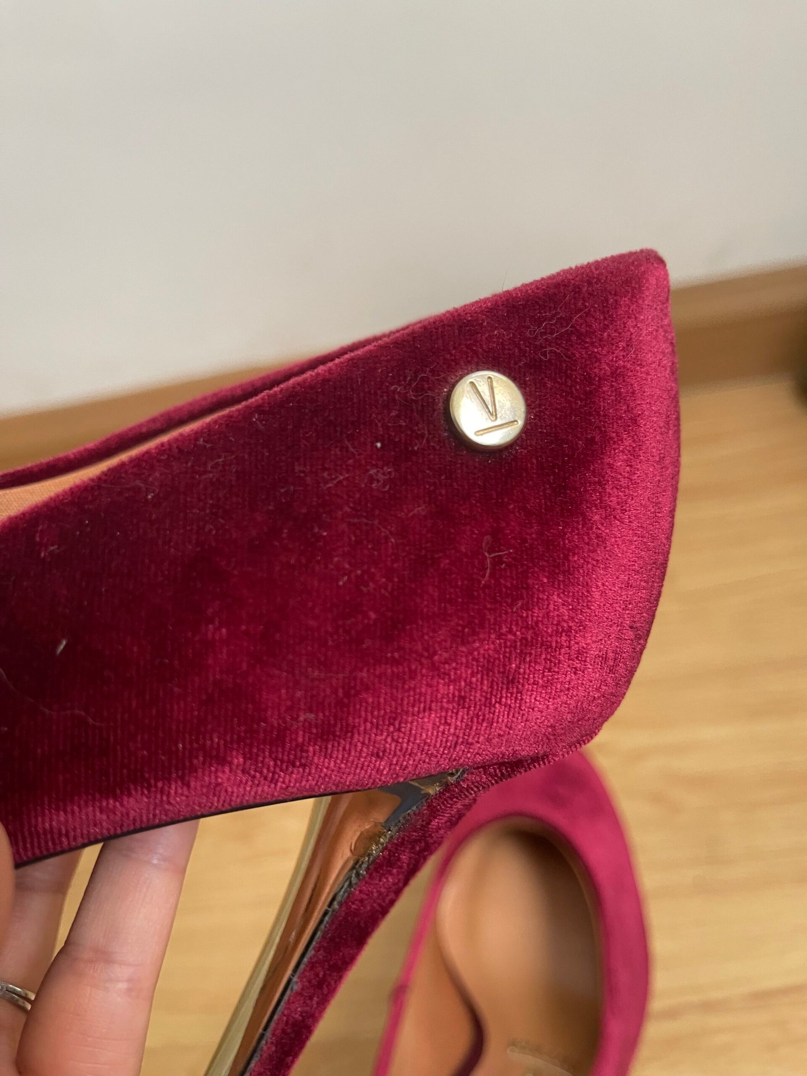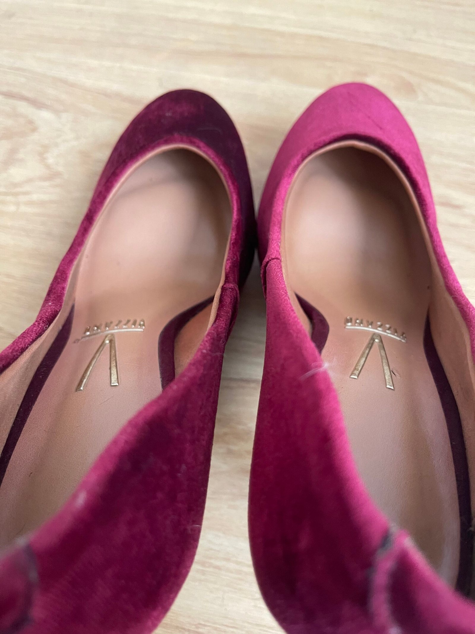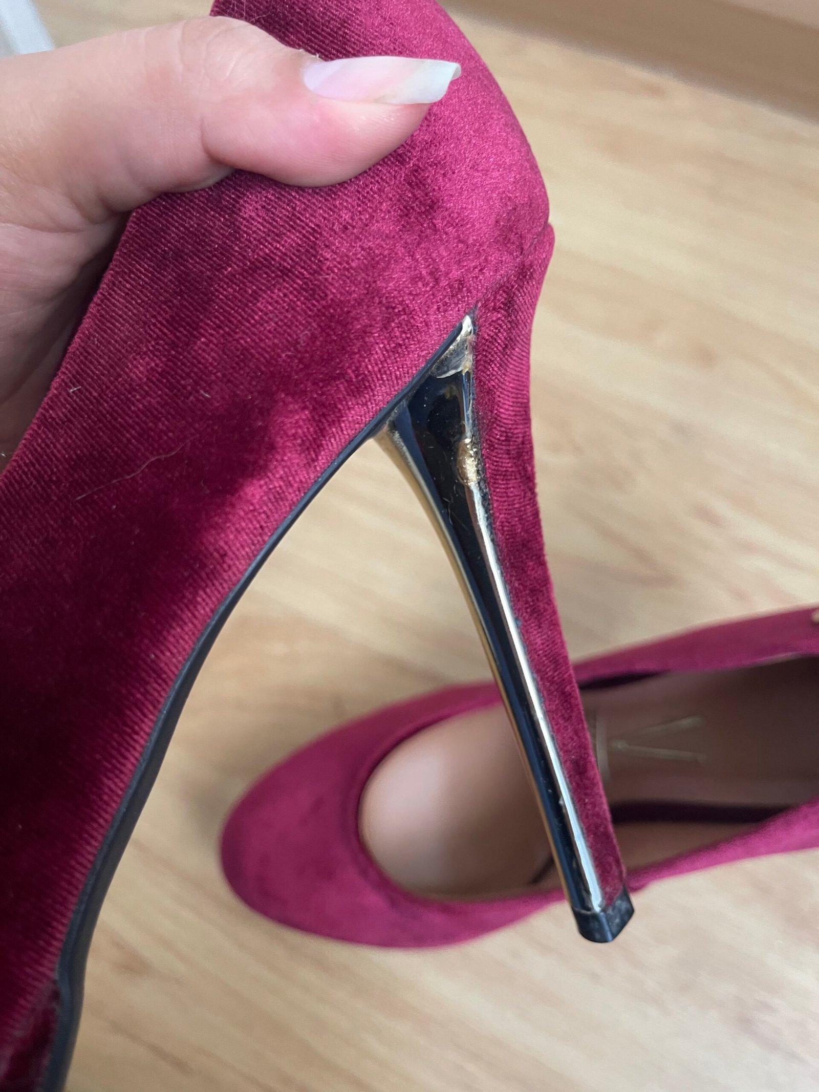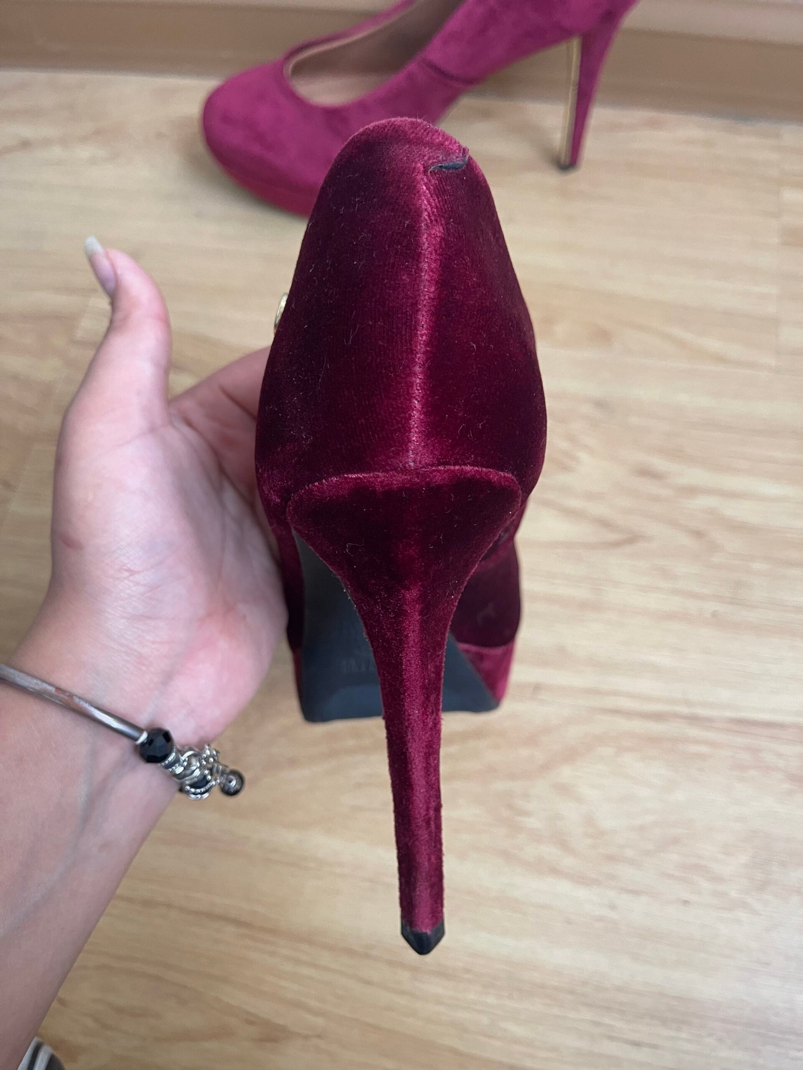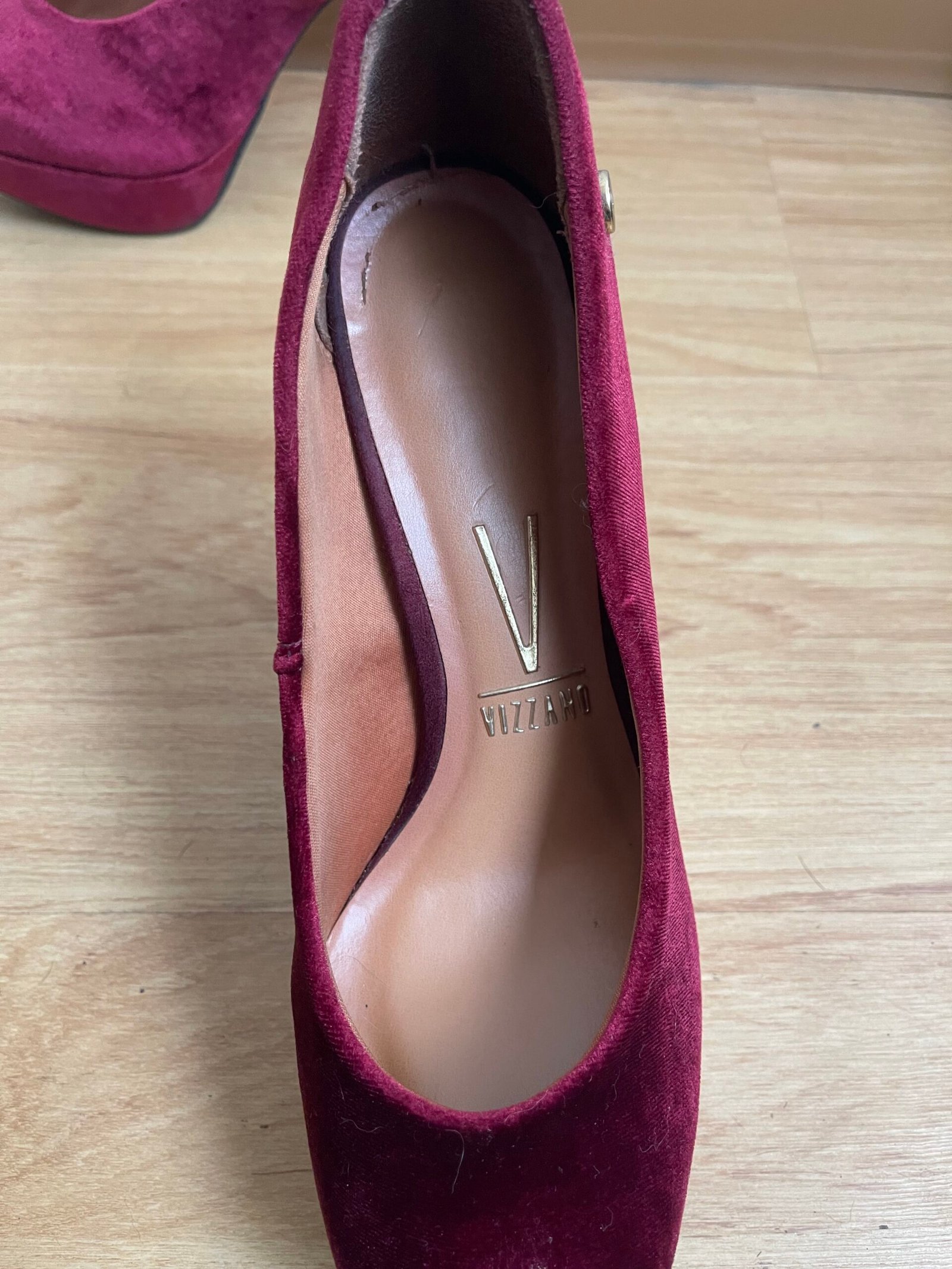 Zapatos nuevos, me los compré y me quedaron grandes yo soy talla 40 y estos tacos son talla 41 aprox 26.5 cm del zapato. Material de terciopelo rojo vino. Taco 12