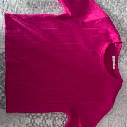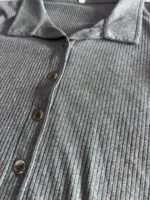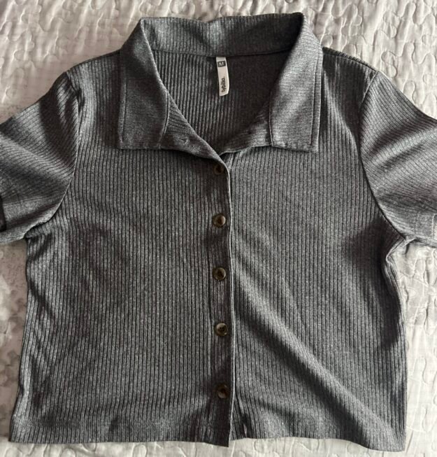 Es una blusa top, puede también usarse como polo, es cómodo y la tela es fresca. Es corto y es talla M, es de un color gris oscuro.