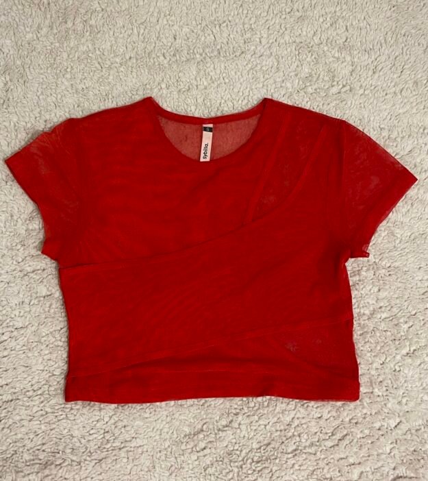 Top transparente rojo, con detalle de tela cruzada. Talla S