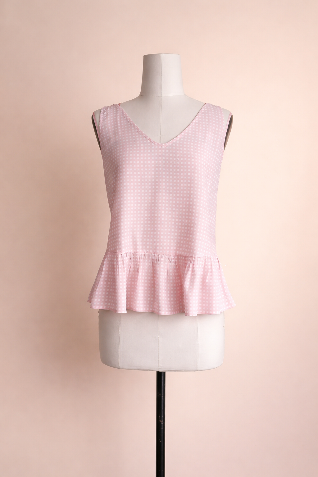 Top sin mangas confeccionado en tela de cuadros vichy rosado blush, con corte peplum a la cintura que realza la silueta y que aporta movimiento y un acabado femenino y sofisticado. Prenda ligera, cómoda y versátil, ideal para looks casuales elegantes o combinaciones más románticas.