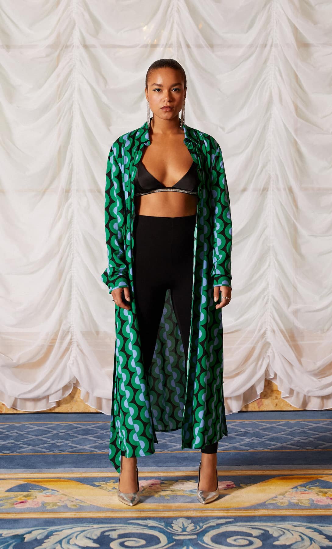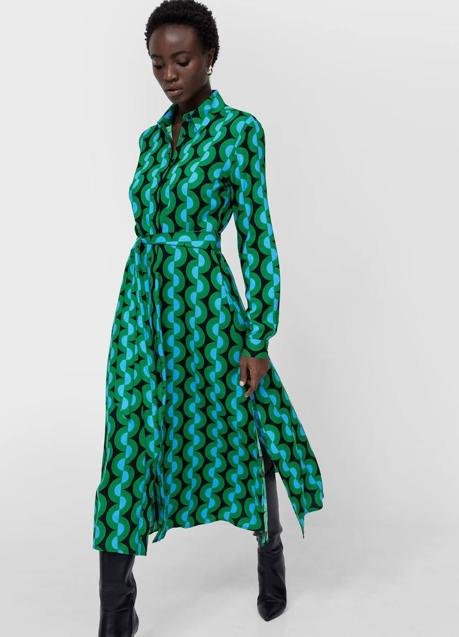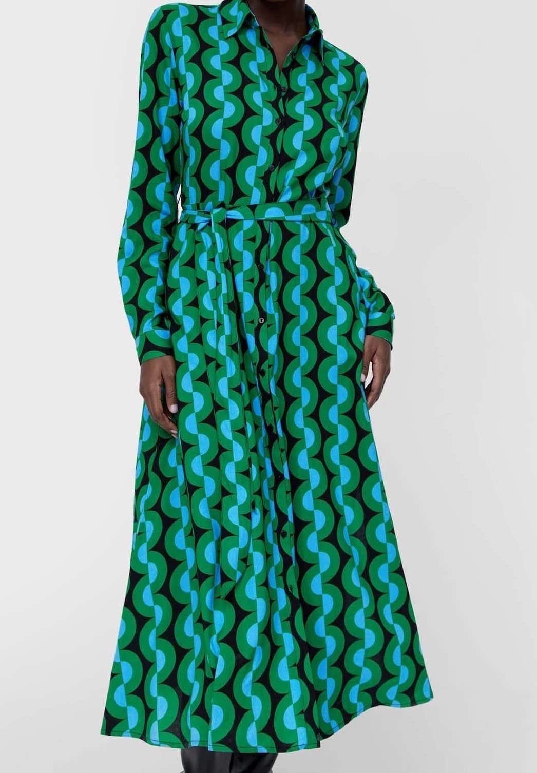 🎨Estilo: Vestido midi con estampado de ondas verdes, celestes, y negras