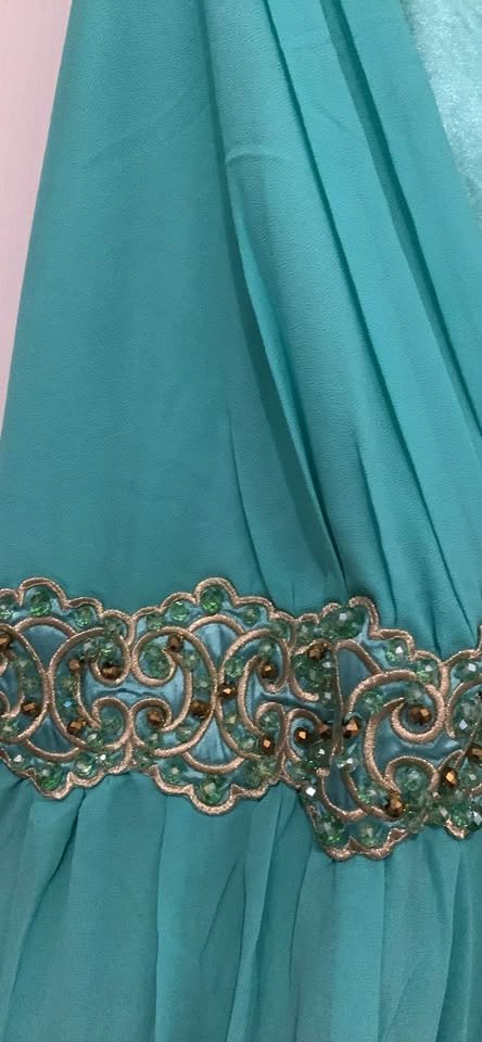 El vestido tiene pedrería y es de gasa fina.
