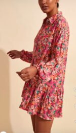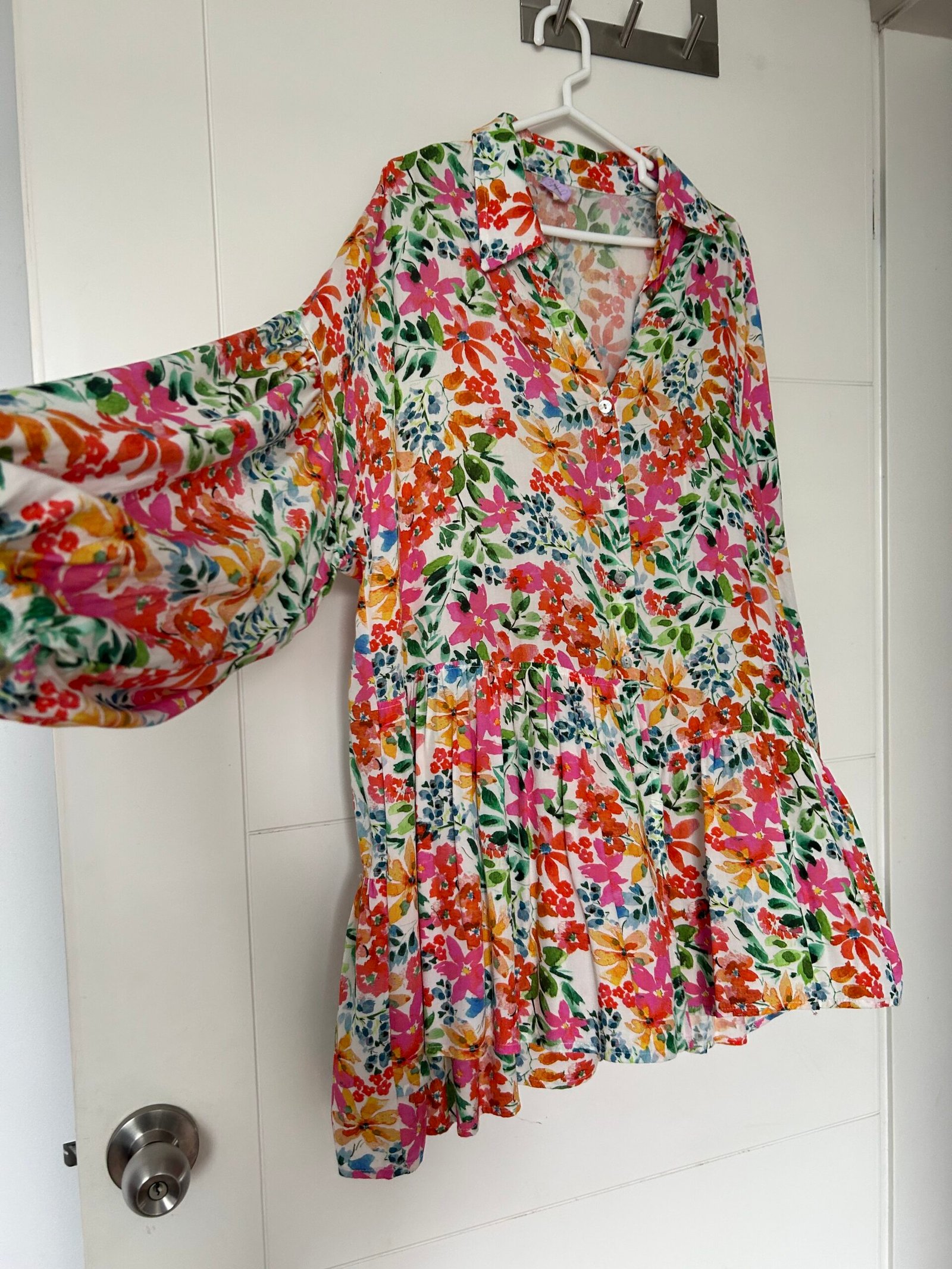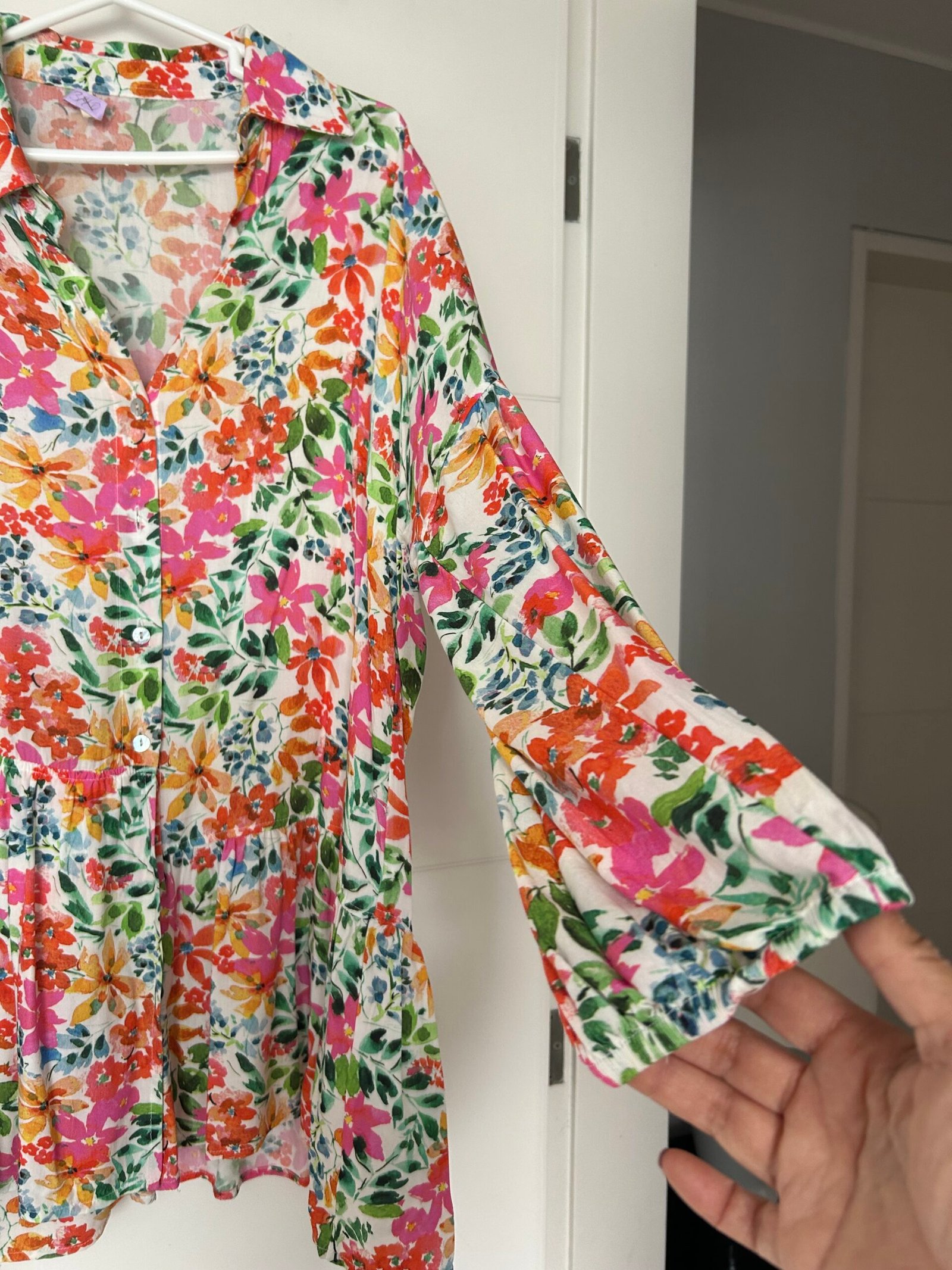 Vestido de verano, estampado, muy ligero, de manga larga, cómodo. Estampado en colores rosa, amarillo, naranja. Talla S oversize. Marca Isla Maria.