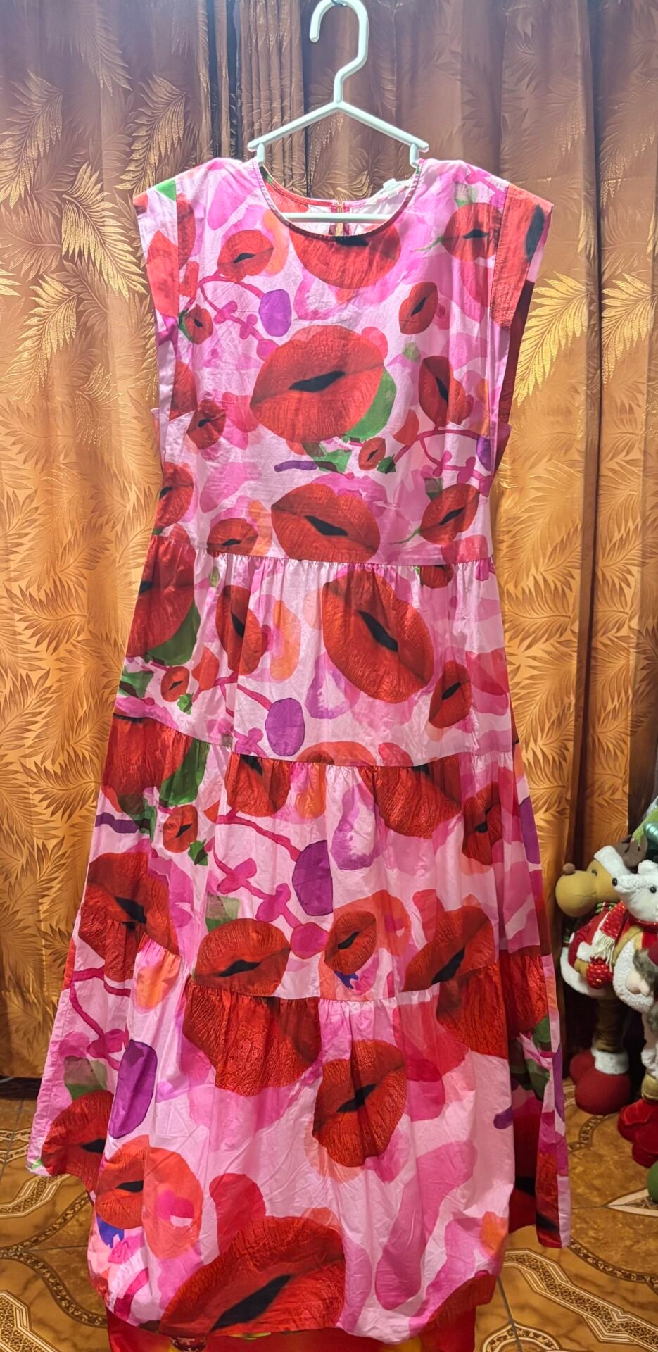 ESTAMPADO DE FLORES CON BESOS, COLOR ROJO CON ROSADO, MANGA CERO. USADO, PERO EN MUY BUEN ESTADO