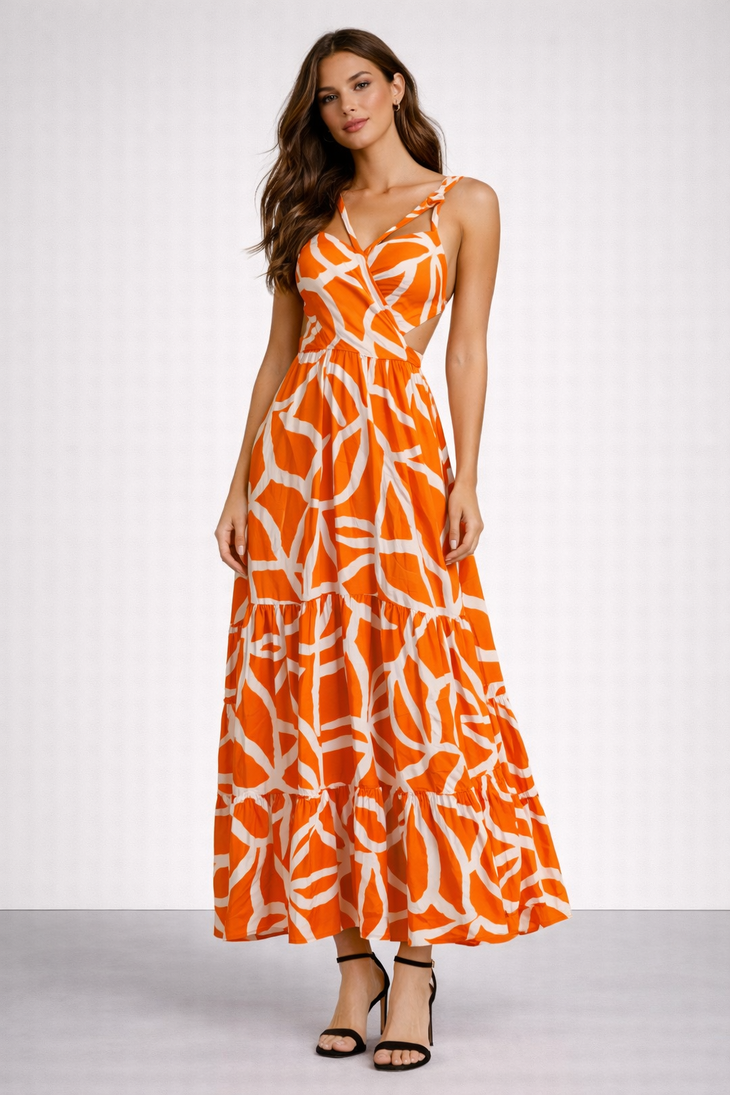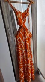 Vestido largo de diseño fresco y femenino, ideal para climas cálidos 🌞. Confeccionado en tela liviana y fluida, presenta un estampado abstracto en tonos naranja vibrante y blanco, muy llamativo y veraniego.