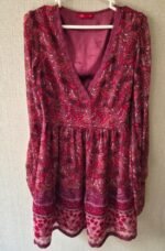 Vestido floreado en tonos burgundy, un solo uso. Talla 36 EUR (equivalente a talla S), tiene forro, elástico en la parte de atrás de la cintura y botones en las mangas. Algunas medidas: largo 86 cm, manga 60 cm (de axila a muñeca), espalda 40cm (de hombro a hombro)