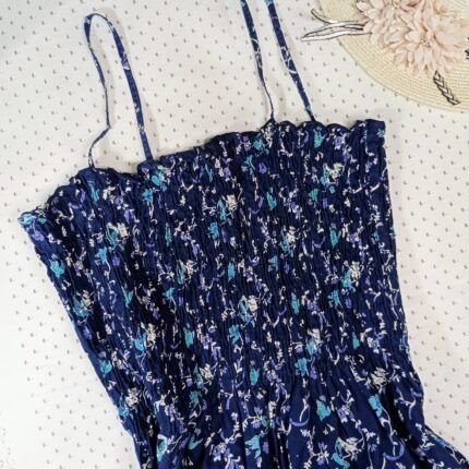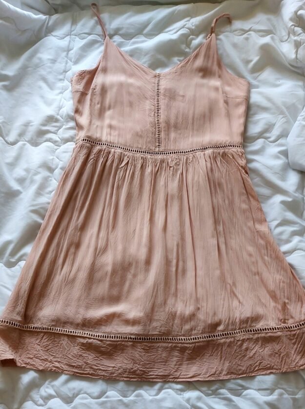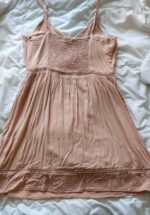 Vestido de tirantes rosa claro, con detalles de encaje troquelado en el escote y la cintura.