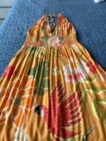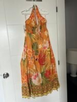 Vestido largo de verano, hasta los tobillos. De tiras, atadas a la nuca. Estampado, en colores naranja, amarillo y verde. Muy fresco. Talla M, marca Z&L Europe, diseñado en Estados Unidos, hecho en la India. Usado una sola vez, prácticamente nuevo.