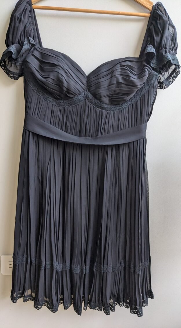 Vestido corto color negro confeccionado a medida (aprox talla L), con detalle tipo corset, en tela semitransparente y falda con plisado con estilo romántico. Incluye detalles de encaje en mangas y en el borde inferior.