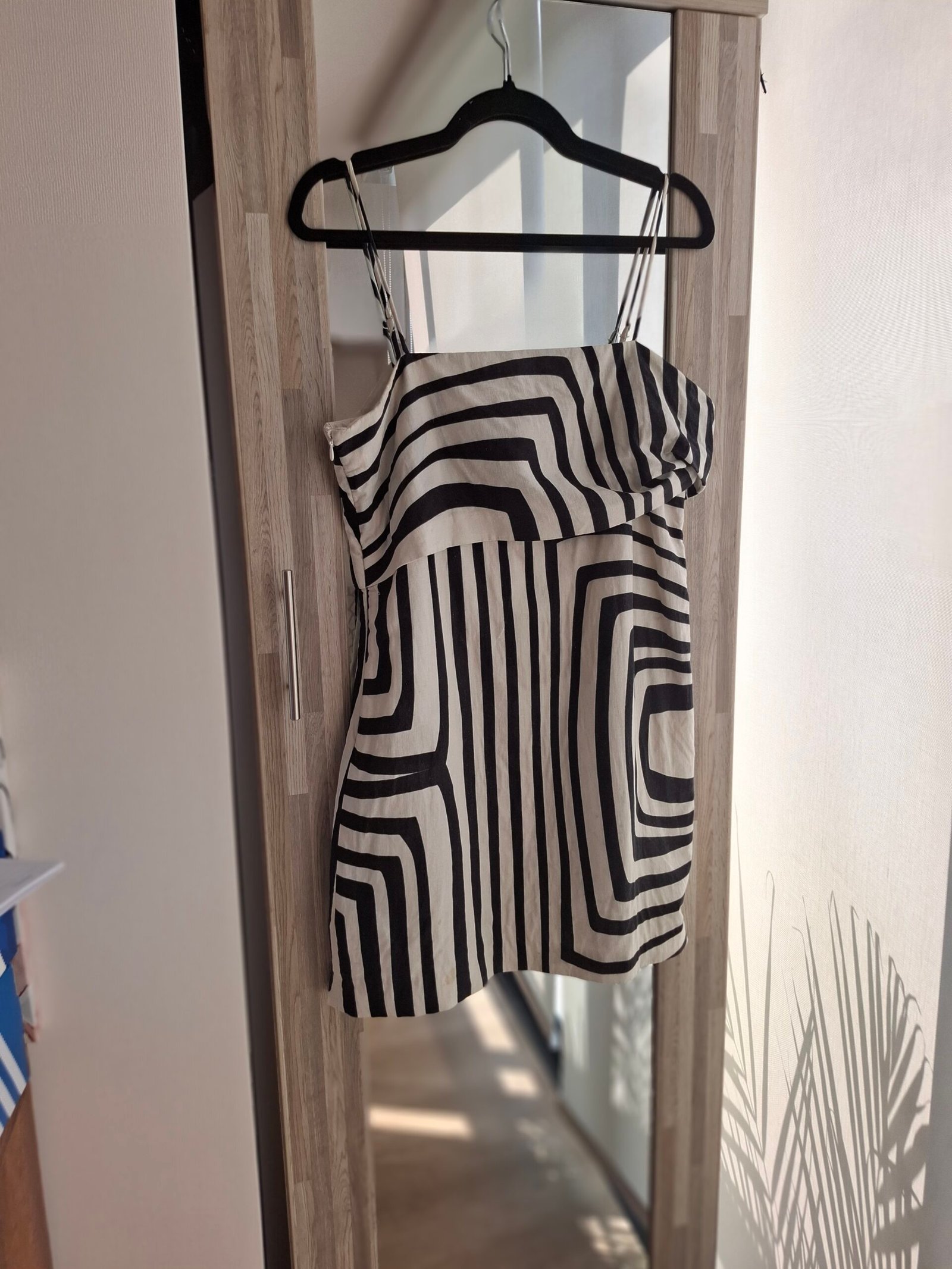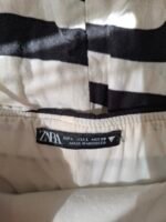 Vestido ZARA confeccionado en lino, ideal para climas cálidos. Diseño moderno y elegante, con estampado geométrico en blanco y negro que estiliza la silueta.