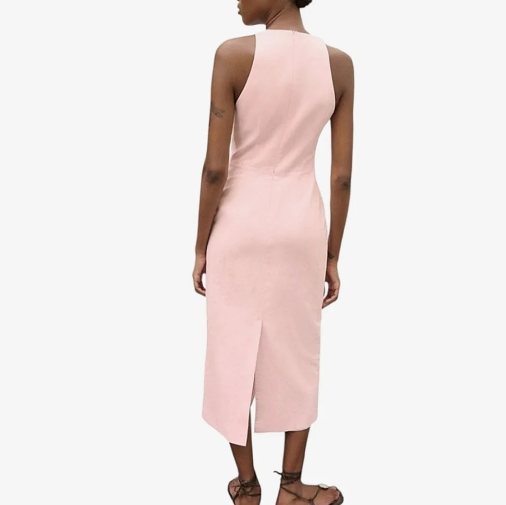 este vestido de mujer con abertura en la espalda y cierre de botones es una pieza elegante y sofisticada. perfecto para ocasiones especiales, su diseño de cintura alta y silueta ajustada realzan la figura. confeccionado en tela ligera y cómoda, es ideal para un look chic y moderno. la abertura en la espalda añade un toque sensual y coqueto, mientras que los botones frontales permiten un ajuste personalizado.