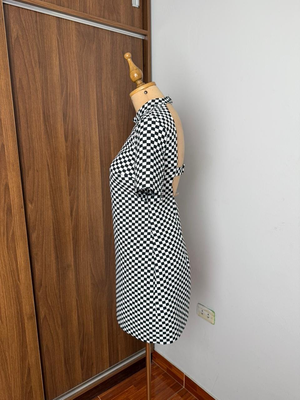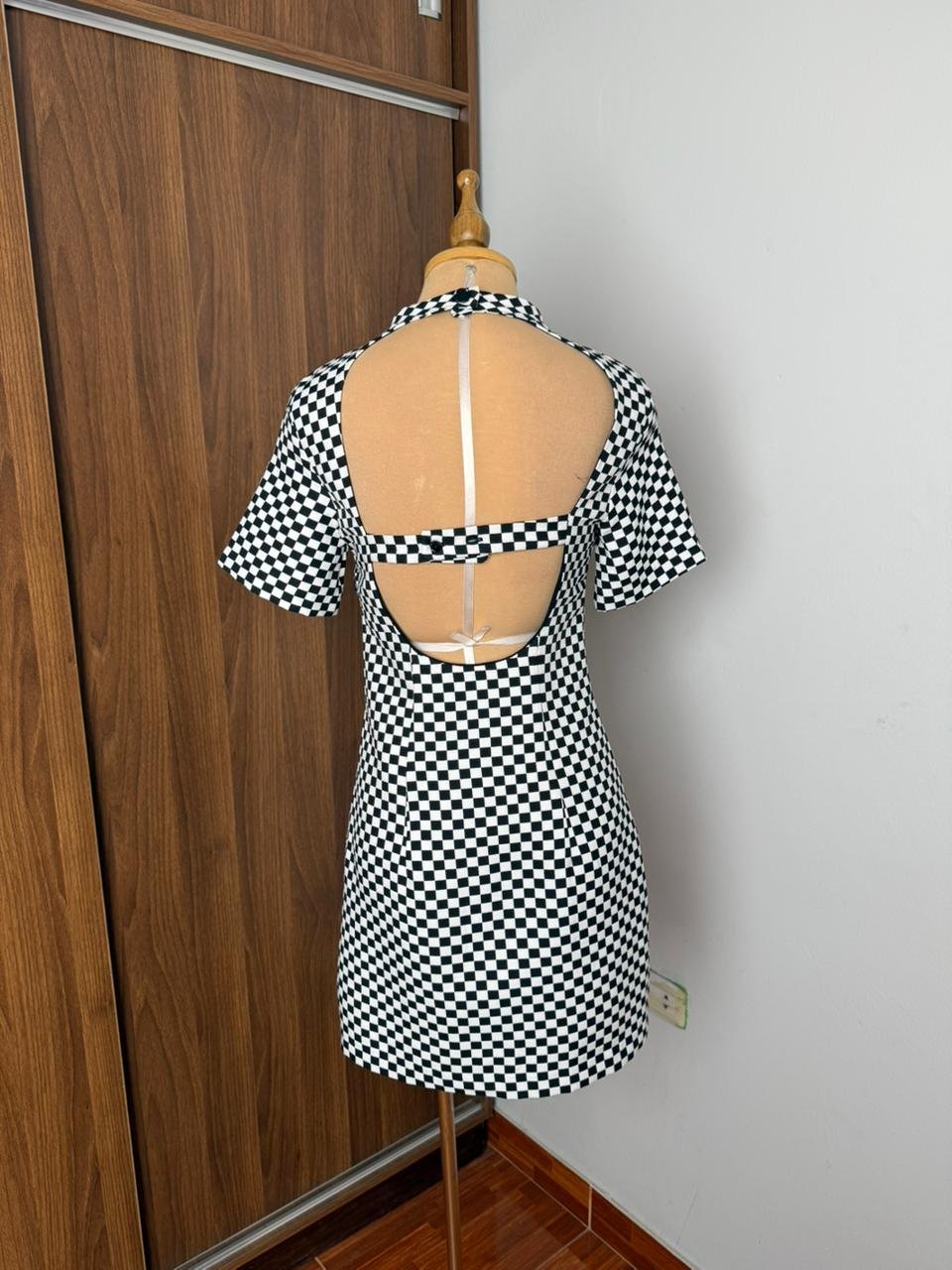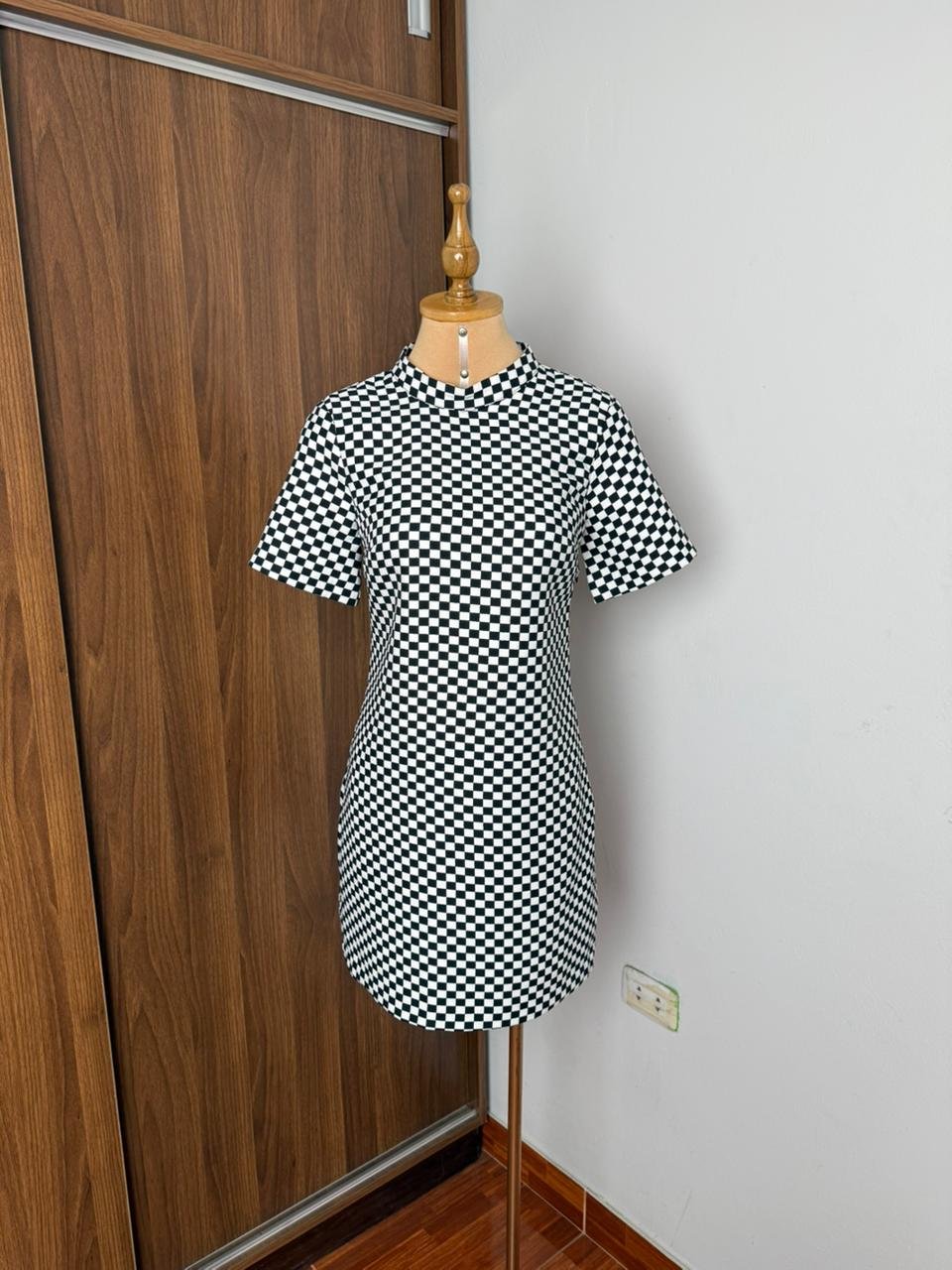 Este elegante vestido de manga corta con estampado de cuadros en blanco y negro es perfecto para cualquier ocasión. su diseño atemporal y cómodo lo convierte en una pieza esencial en tu guardarropa. añade un toque de estilo a tus atuendos diarios con este versátil vestido que combina a la perfección con cualquier accesorio.
