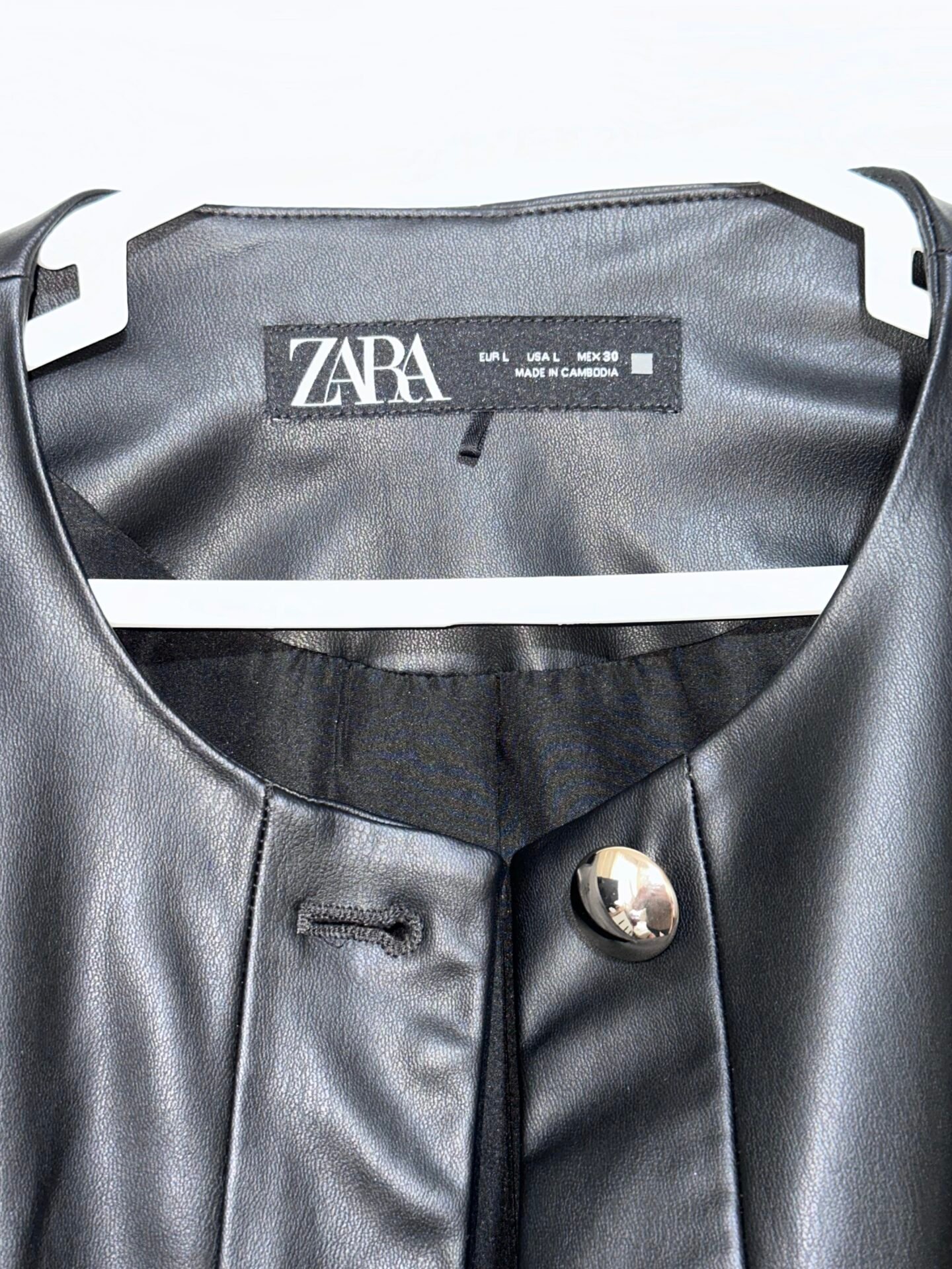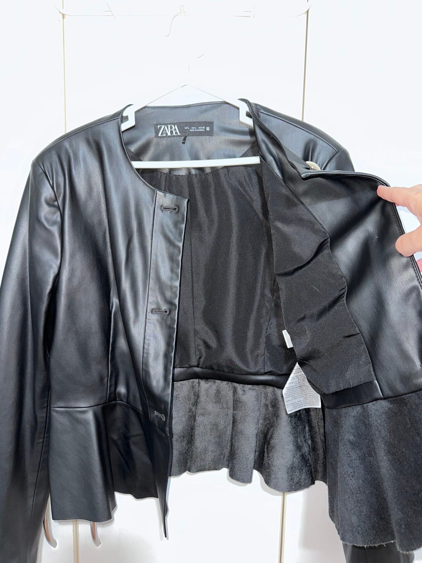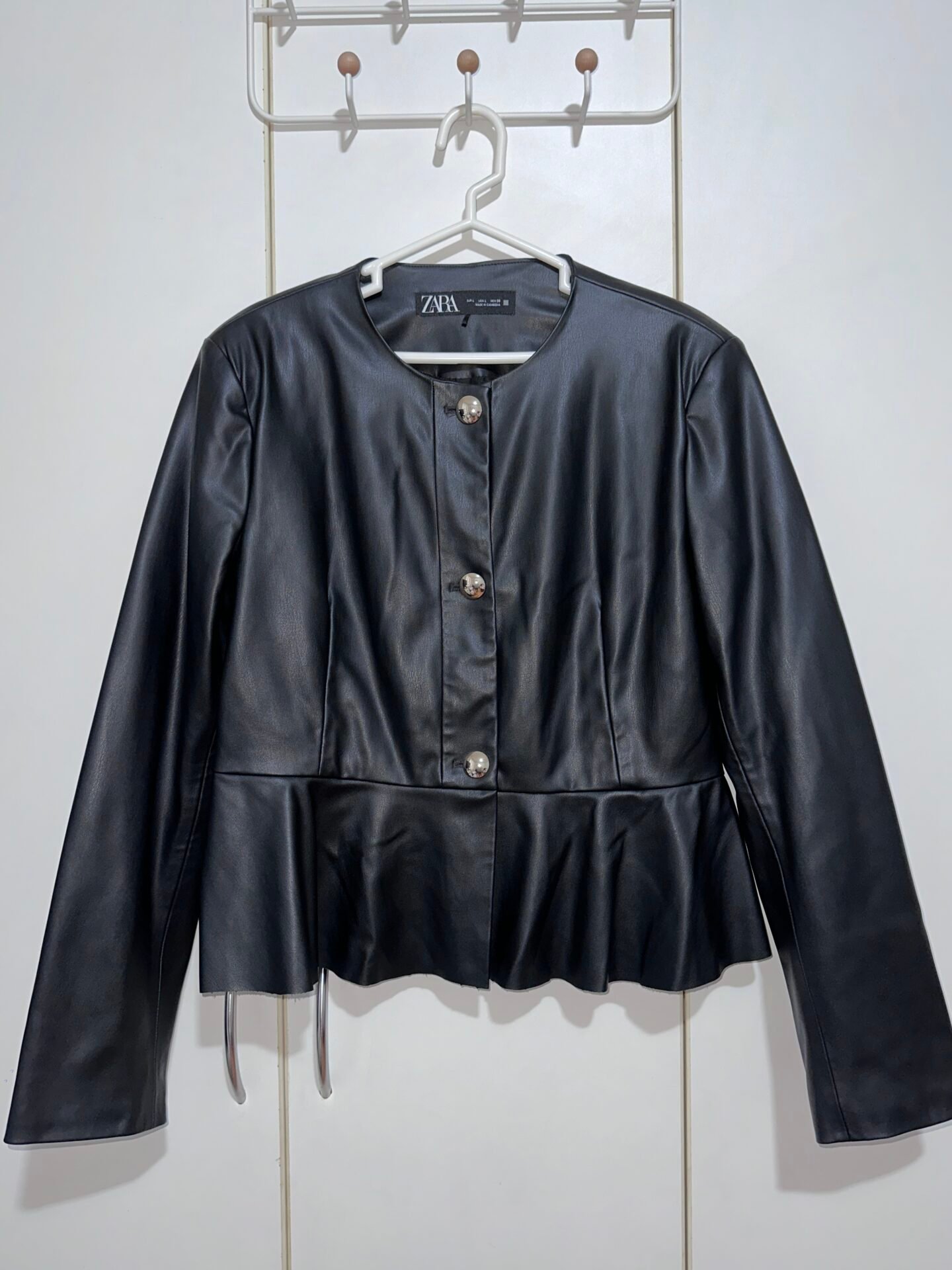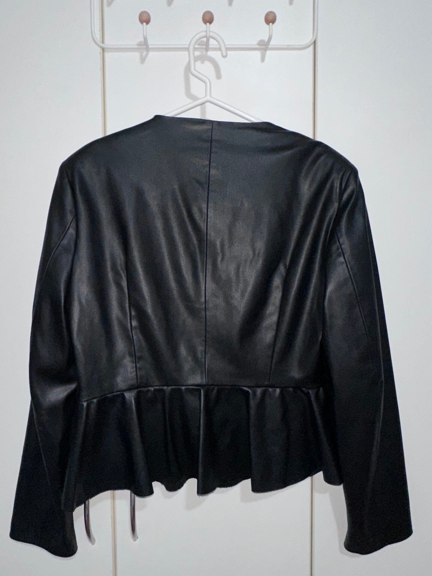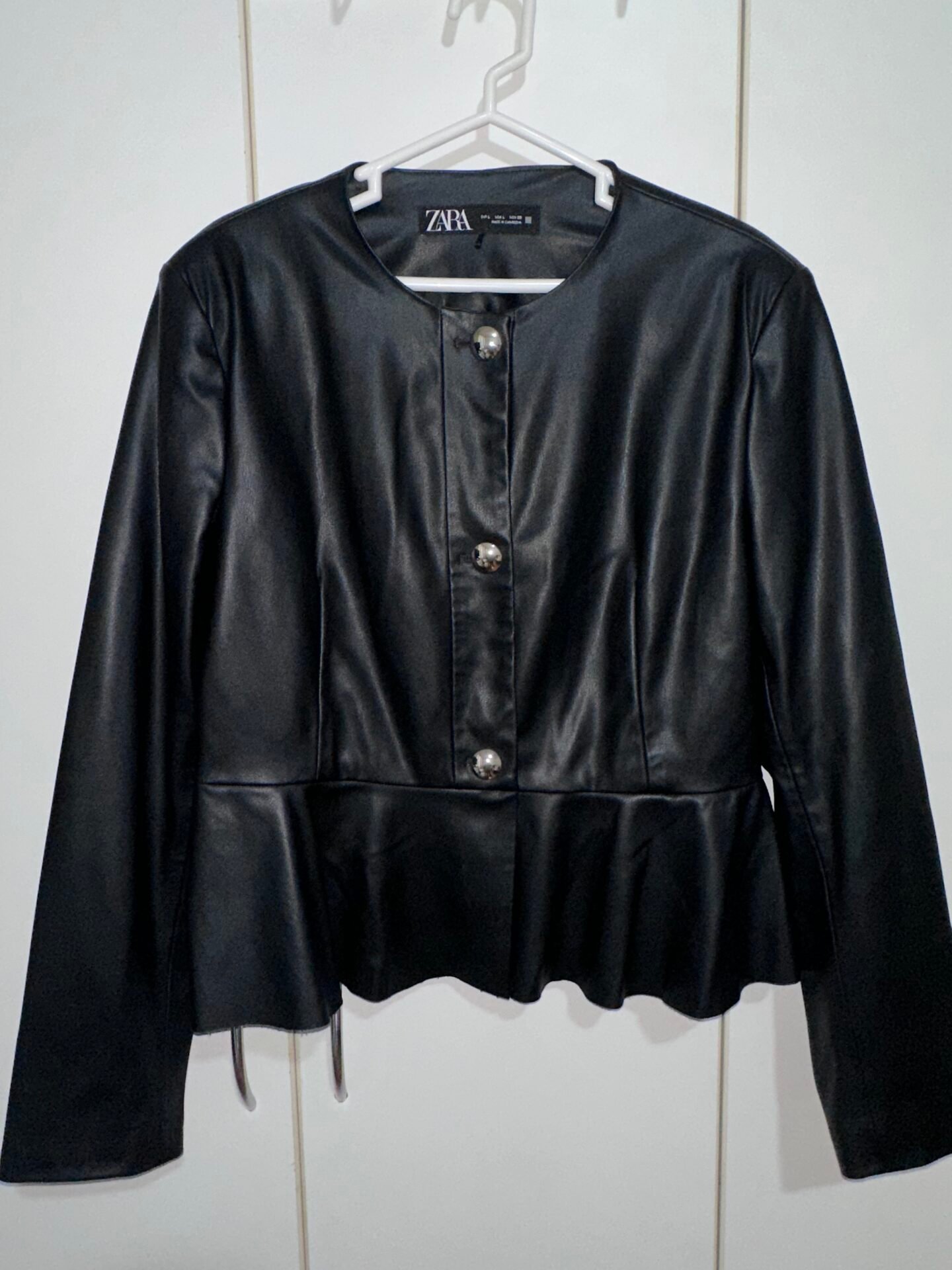 Chaqueta de cuerina marca ZARA, negra, con hombreras y volado.